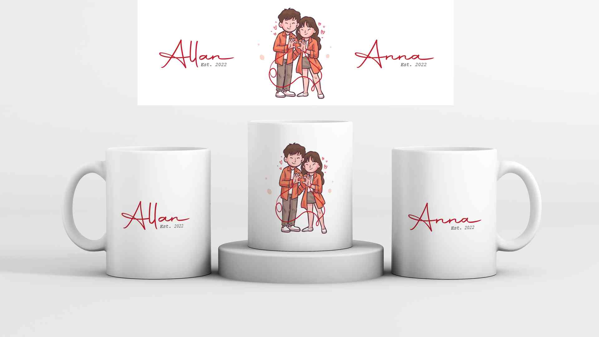 Mug Valentine ini memiliki desain yang manis dan penuh kasih, menampilkan ilustrasi kartun pasangan pria dan wanita yang sedang berdampingan dengan penuh kehangatan. Karakter-karakter tersebut digambar dengan gaya yang ceria dan penuh ekspresi cinta, menciptakan kesan romantis yang menyentuh hati. Di bagian kanan mug, terdapat tulisan "Happy Valentine" yang ditulis dengan font yang lembut dan elegan, menyuarakan kebahagiaan di hari spesial ini. Di bawahnya, terdapat nama pasangan yang bisa disesuaikan, memberikan sentuhan personal yang menjadikan mug ini semakin istimewa. Desain ini sangat cocok untuk pasangan yang ingin merayakan Hari Valentine dengan cara yang unik dan penuh makna. Mug ini tidak hanya memberikan kehangatan saat menikmati minuman, tetapi juga menjadi simbol cinta yang abadi.