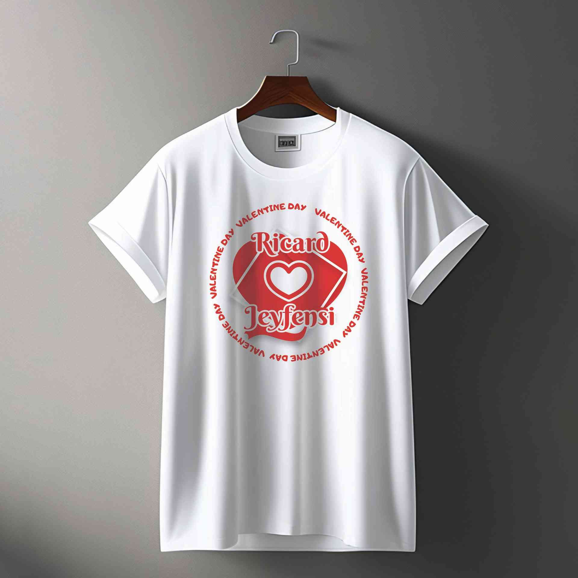 Desain kaos yang Anda buat memiliki tema Valentine dengan konsep yang romantis dan personal. Berikut adalah deskripsi lengkapnya:1. Warna dan Bahan Ka...