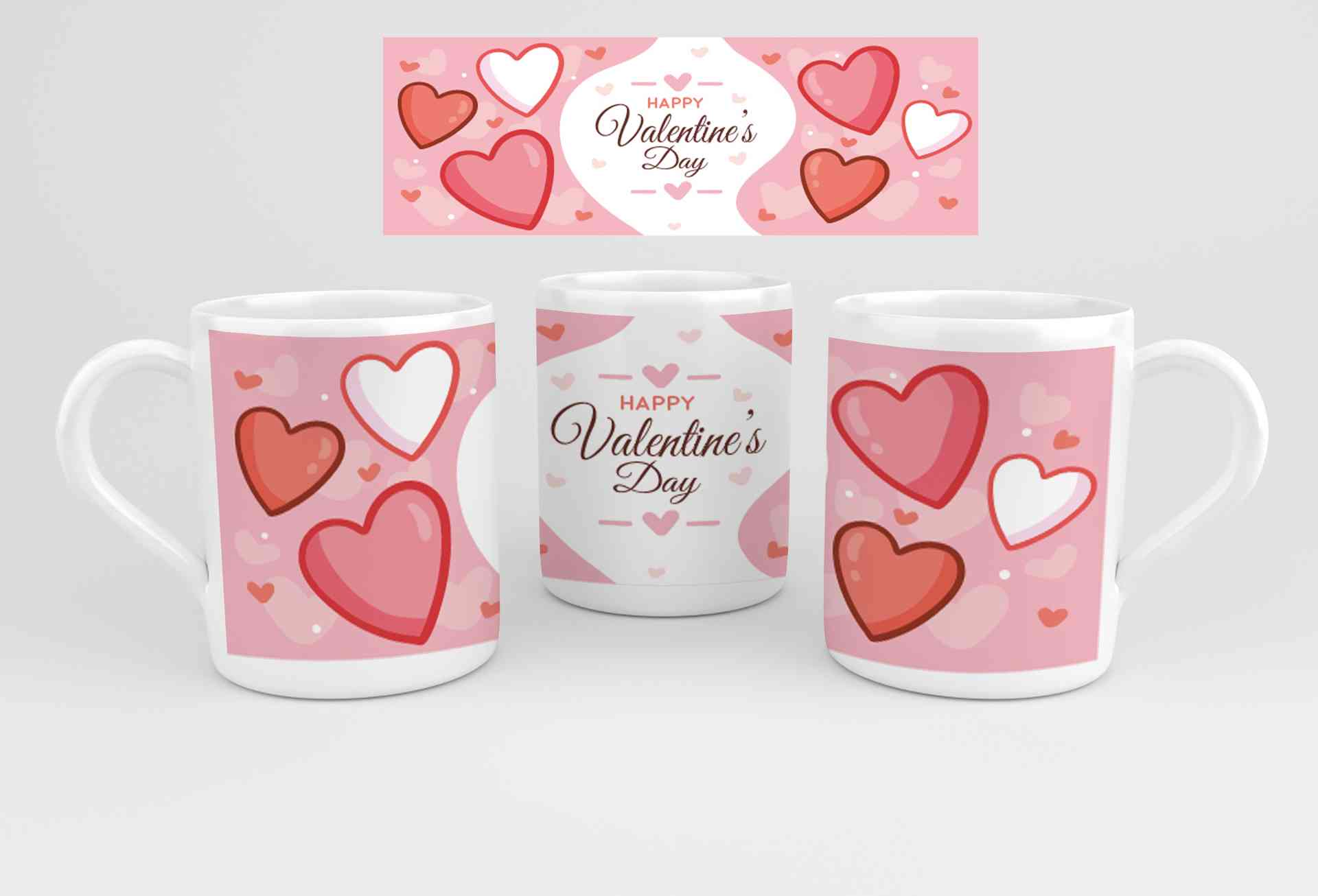 Gambar ini menampilkan tiga cangkir atau mug dengan desain bertema cinta, yang disusun dalam tampilan mockup. Berikut adalah deskripsi rinci dari desa...