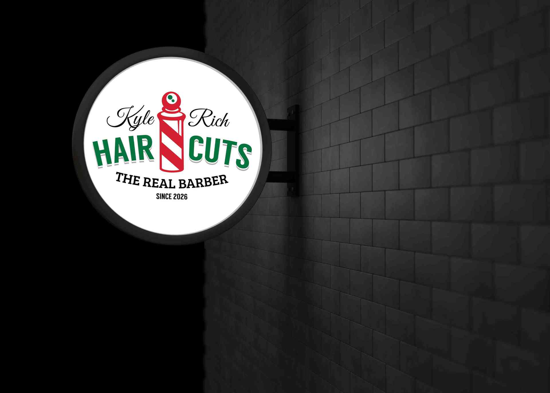Neon box bulat ini menampilkan desain barbershop dengan gaya modern dan eye-catching. Terdapat ilustrasi barber pole merah putih di tengah tulisan “HA...