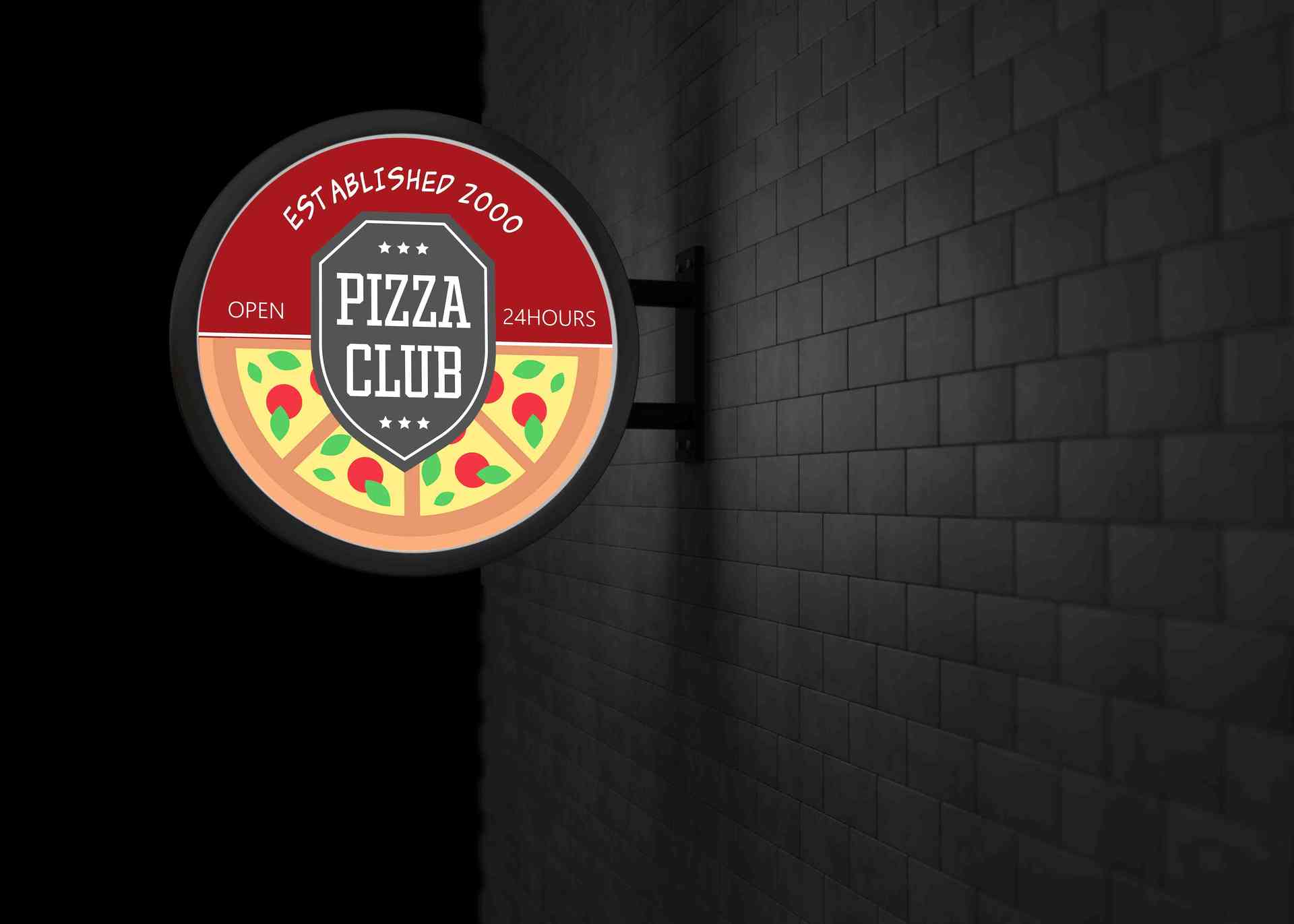 Neon box bulat ini menampilkan branding Pizza Club dengan desain klasik modern yang menarik perhatian. Bagian atasnya berwarna merah maroon dengan tul...