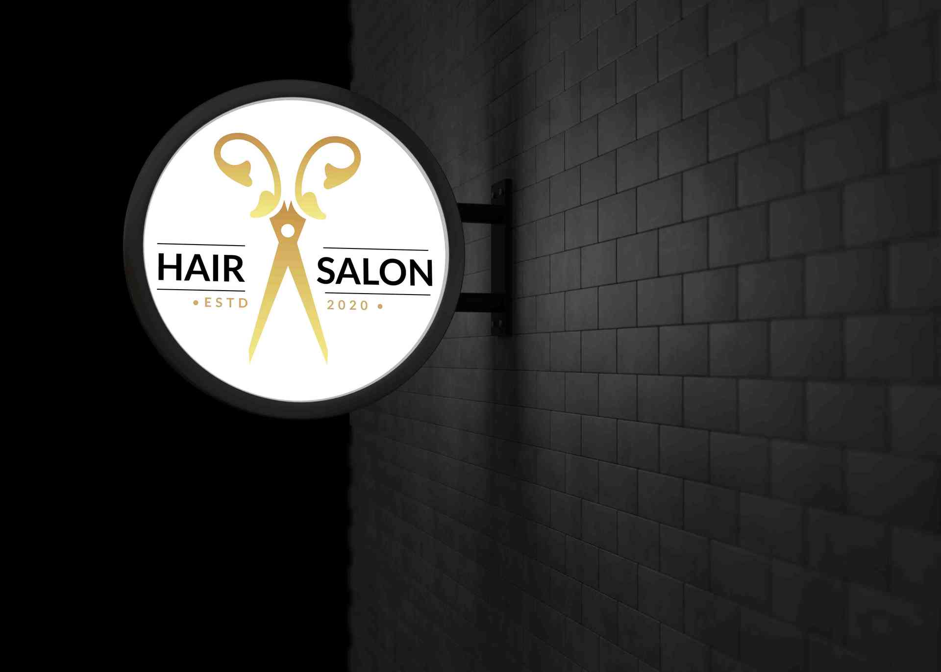 Desain neon box bulat ini menghadirkan tampilan mewah dan elegan untuk branding Hair Salon. Logo gunting rambut berwarna emas di tengah menjadi fokus...