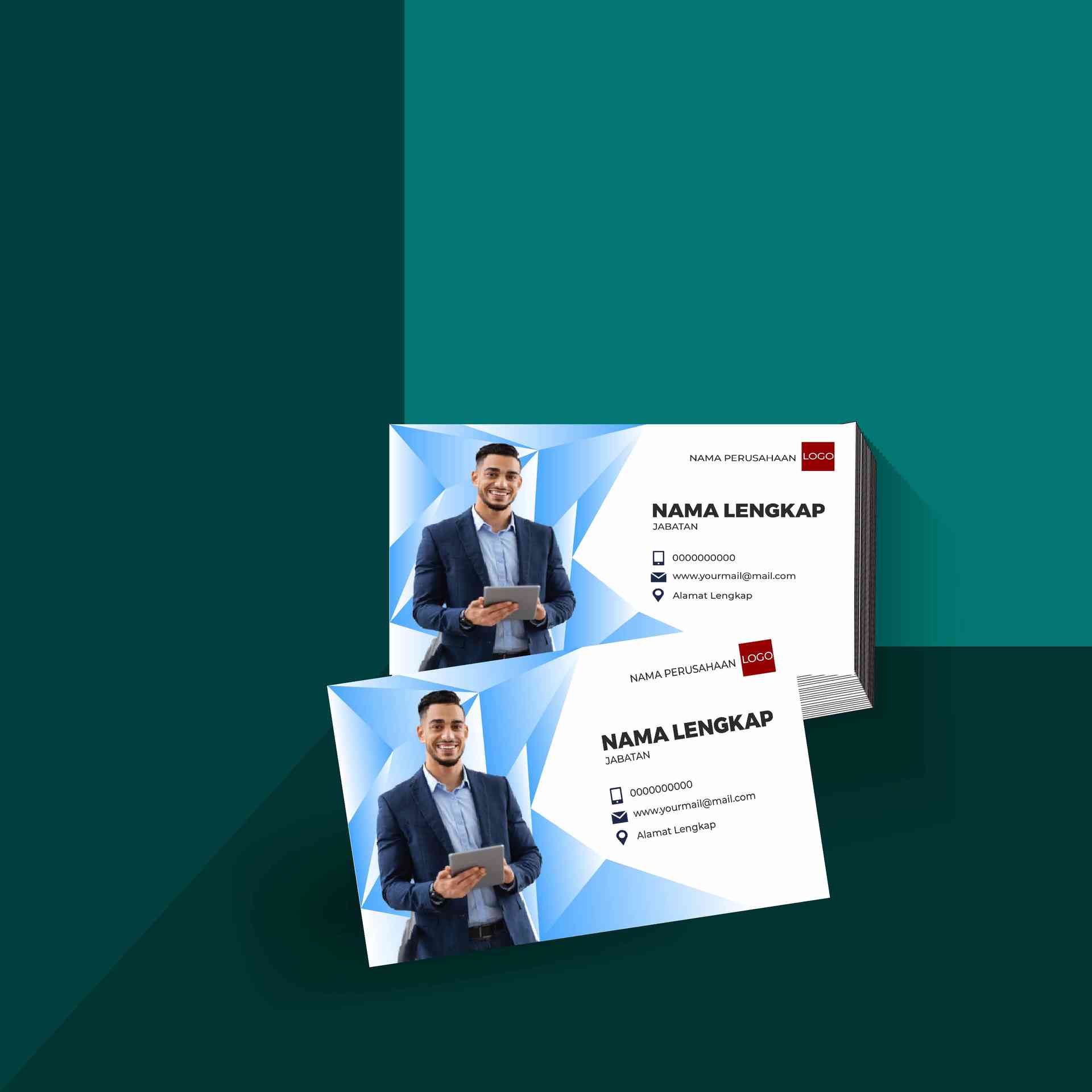 Kartu nama bentuk persegi panjang horizontal ini menonjolkan desain geometris simetris dengan nuansa biru yang dominan dan aksen putih bersih, mencipt...