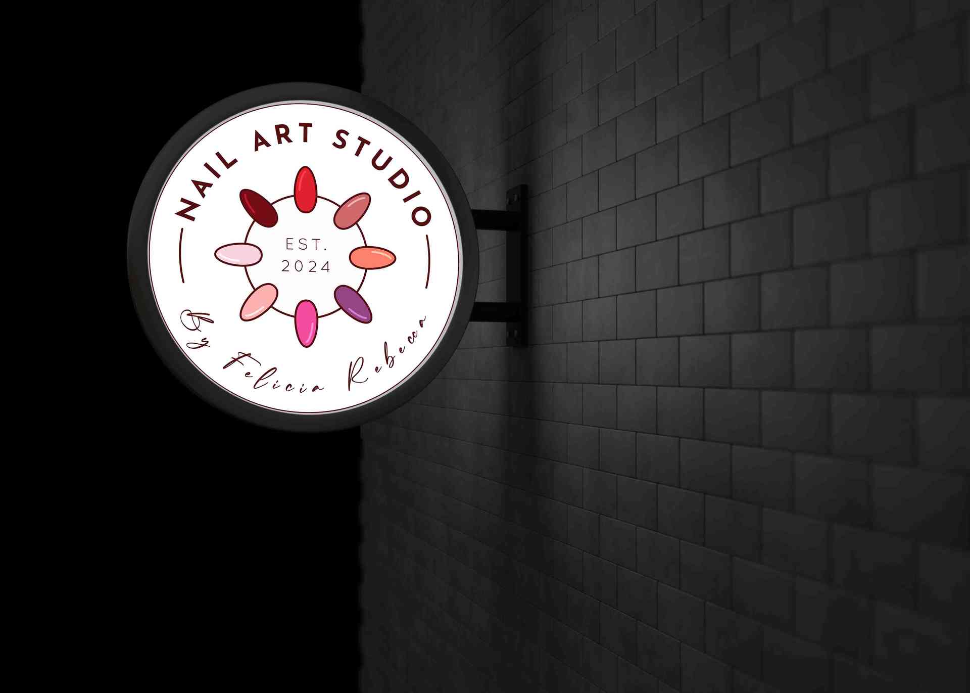 Neon box bulat ini menampilkan desain logo Nail Art Studio dengan ilustrasi kumpulan kuku warna-warni yang disusun melingkar seperti roda warna, membe...