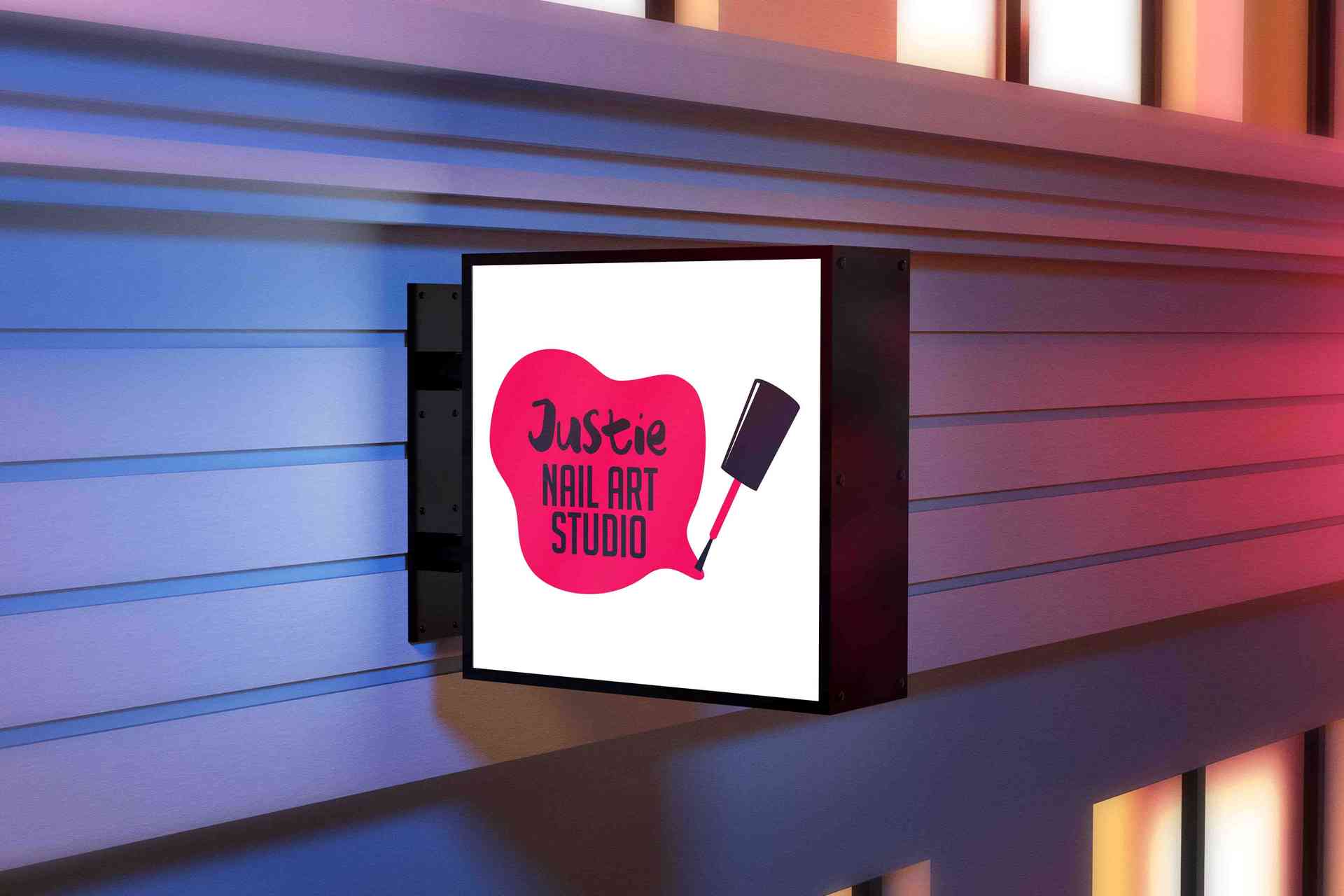 Neon box kotak ini menampilkan desain logo Justie Nail Art Studio dengan ilustrasi cat kuku berwarna pink fuchsia yang menciptakan kesan playful dan f...