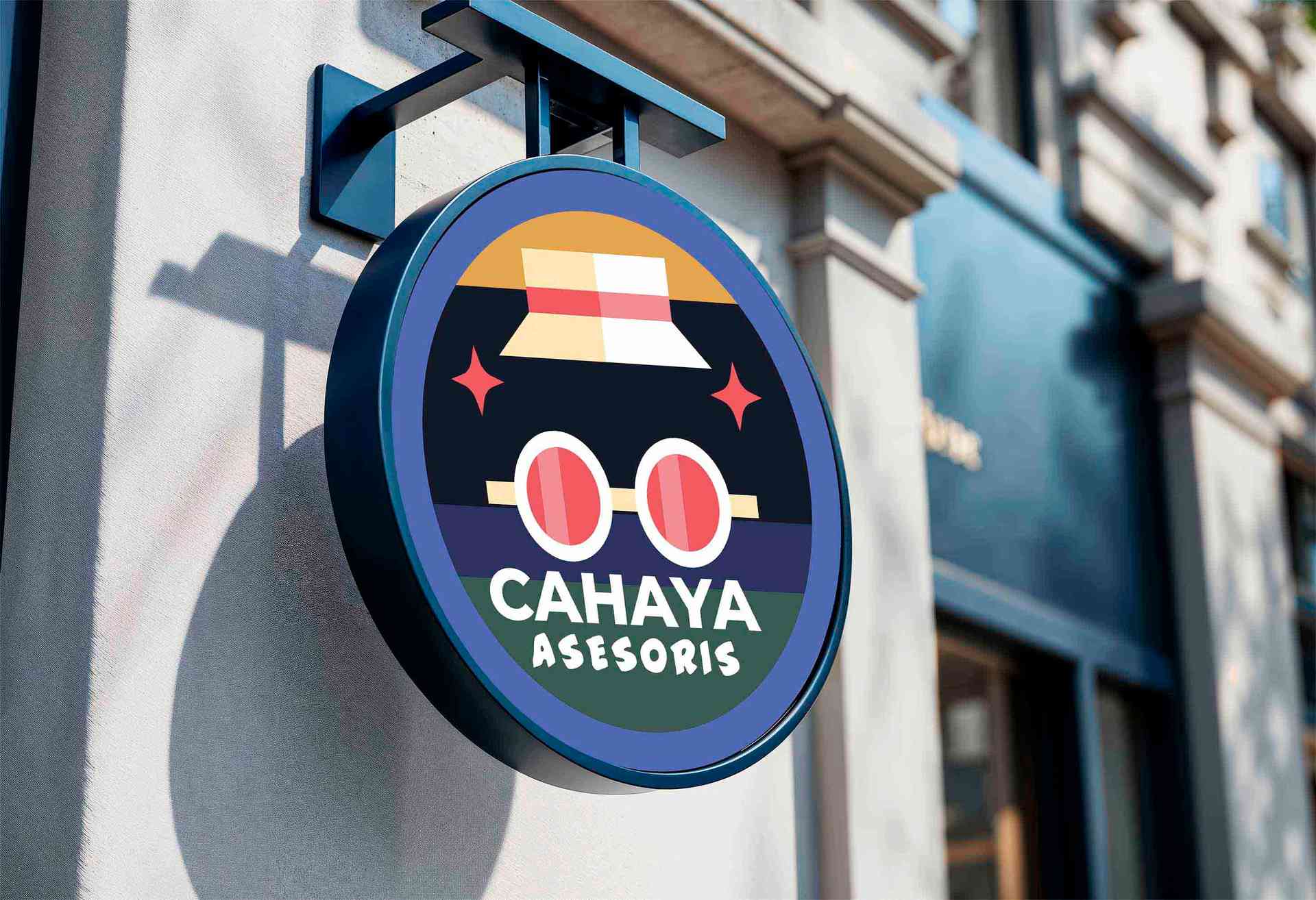 Neon box Cahaya Asesoris mengusung desain playful dengan ikon topi dan kacamata berwarna cerah, menggambarkan toko aksesoris yang trendy dan kekinian....