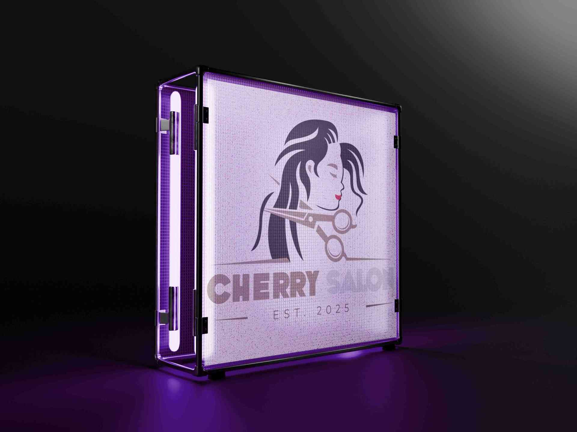Desain neon box kotak ini menampilkan siluet wajah wanita berambut panjang bergelombang berwarna hitam dengan aksen bibir merah, mencerminkan kecantik...
