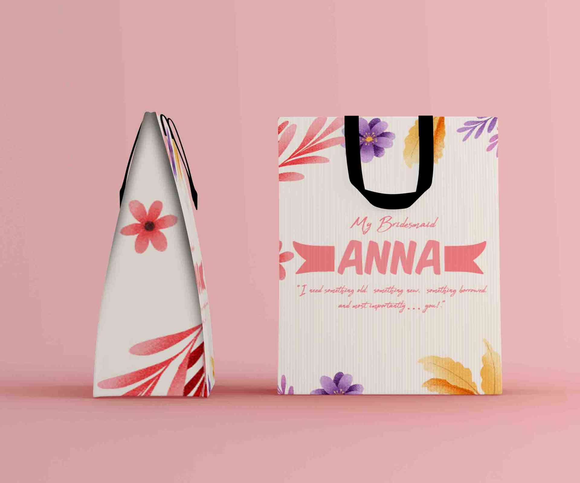 Paper bag ini didesain khusus sebagai bentuk apresiasi untuk para bridesmaid dengan nuansa kartun yang menggemaskan dan penuh kehangatan. Sisi depan menampilkan ilustrasi pengantin wanita bersama lima sahabat perempuan dengan pose ceria, dilengkapi nama personalisasi “Anna” sebagai ucapan terima kasih. Sementara bagian belakang dihiasi kutipan romantis bertuliskan, “I need something old, something new, something borrowed, and most importantly… you!”—yang memperkuat kesan personal dan bermakna. Dominasi warna pink pastel dan ilustrasi bunga hati di sisi samping menambah kesan manis serta penuh cinta. Sangat cocok sebagai hadiah kecil dan kenang-kenangan spesial untuk sahabat di hari pernikahanmu.