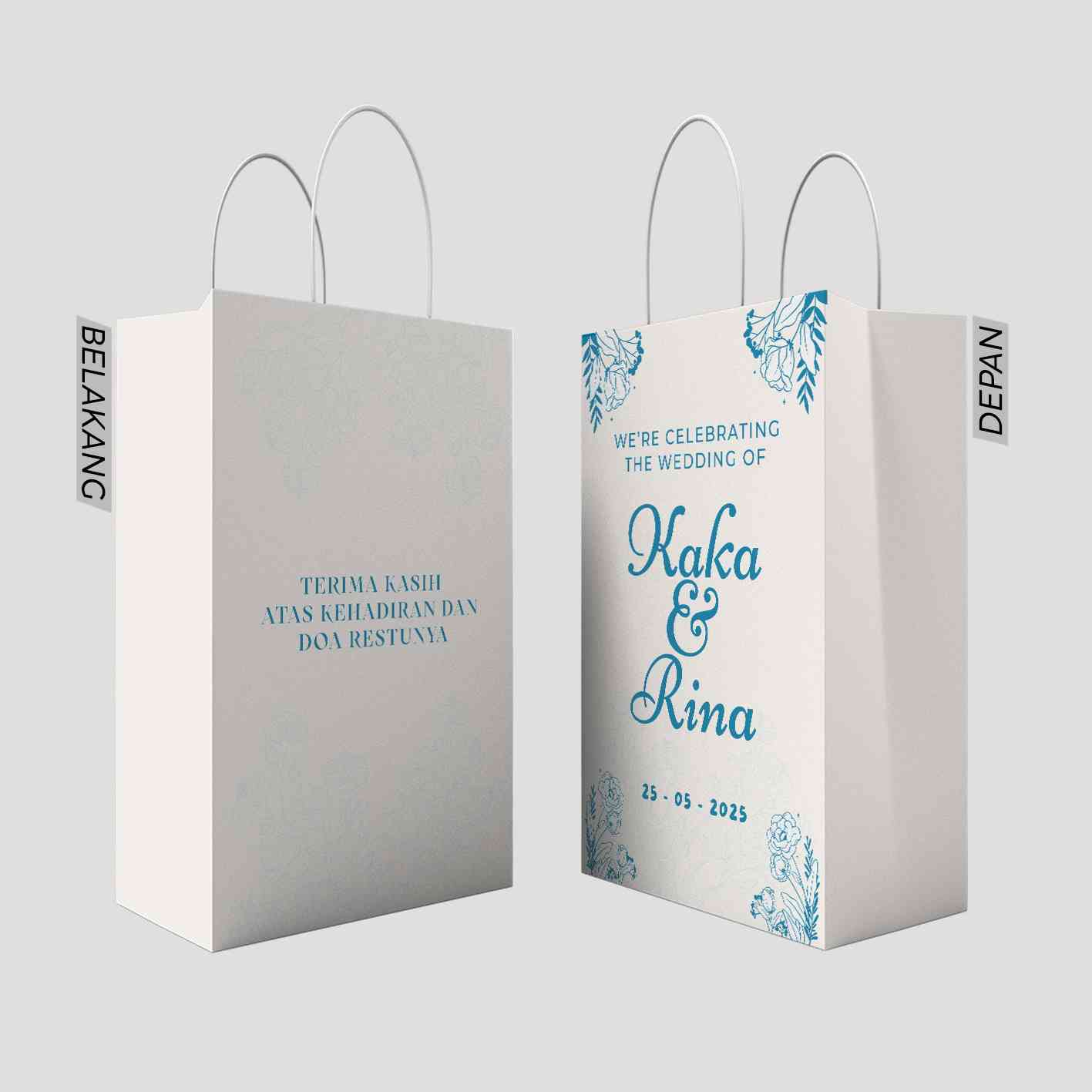 Tas kertas putih dengan desain bunga berwarna biru di bagian depan dan sudut atas tas memberikan nuansa romantis dan elegan. Nama pasangan pengantin t...