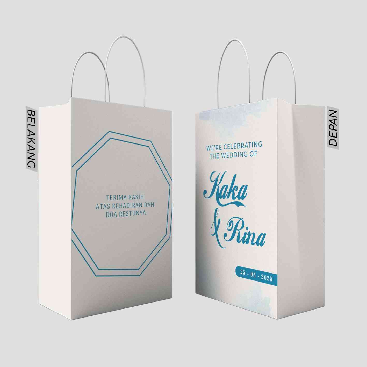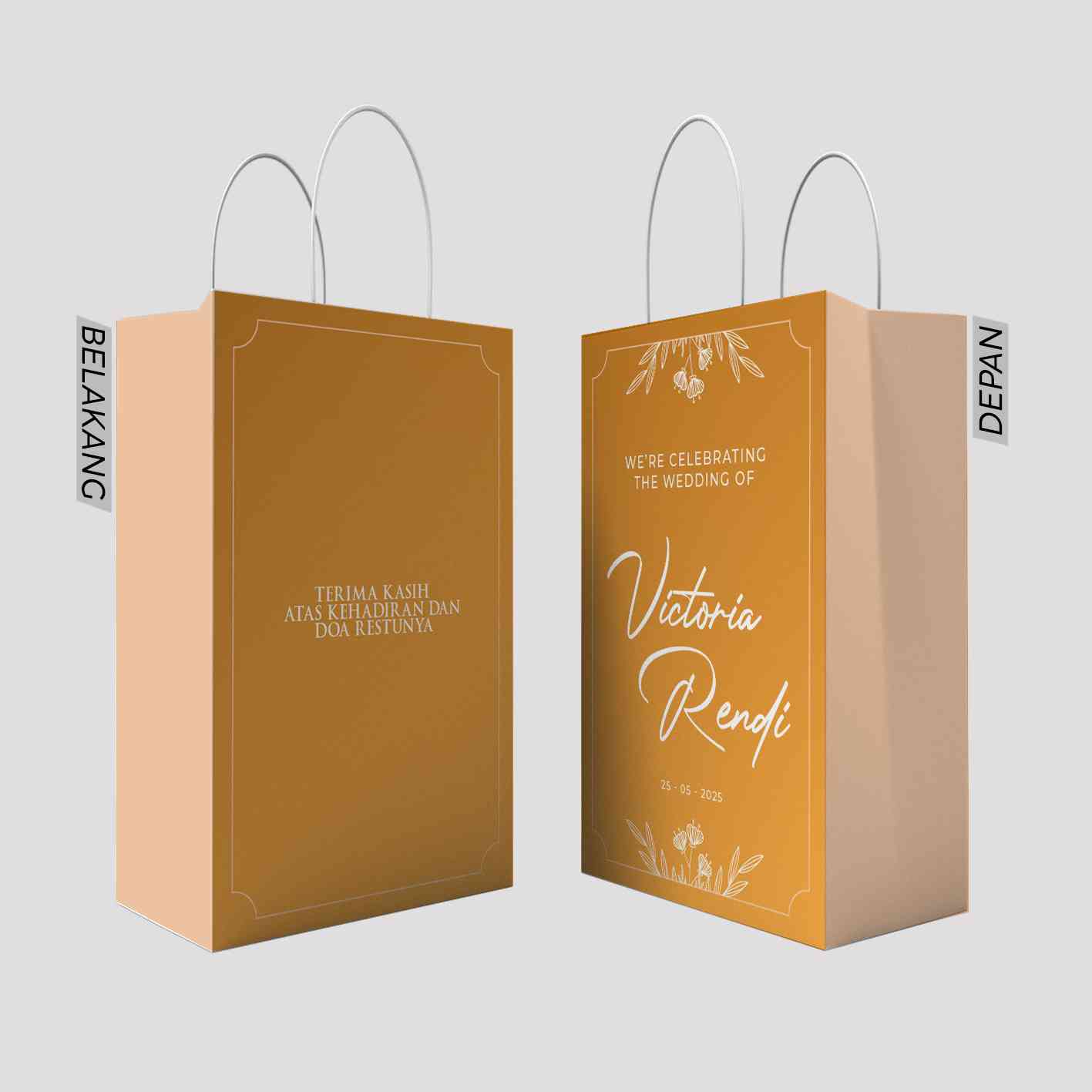 Paper bag putih yang cantik ini dihiasi dengan desain bunga pastel yang lembut, memberikan kesan alami dan romantis. Bunga-bunga yang menghiasi paper bag ini menambah kesan segar dan hidup, sangat cocok untuk pernikahan dengan tema musim semi atau bunga. Nama pasangan pengantin tercetak dengan font modern yang serasi di bagian depan paper bag, sementara tanggal pernikahan yang terletak di bawahnya memberikan informasi yang jelas. Di bagian belakang paper bag, terdapat ucapan terima kasih yang ditulis dengan font kecil yang tetap elegan dan penuh penghargaan. Paper bag ini cocok untuk pasangan yang menginginkan pernikahan dengan nuansa alami dan romantis, di mana setiap detail memberikan kesan kehangatan dan kebahagiaan.
