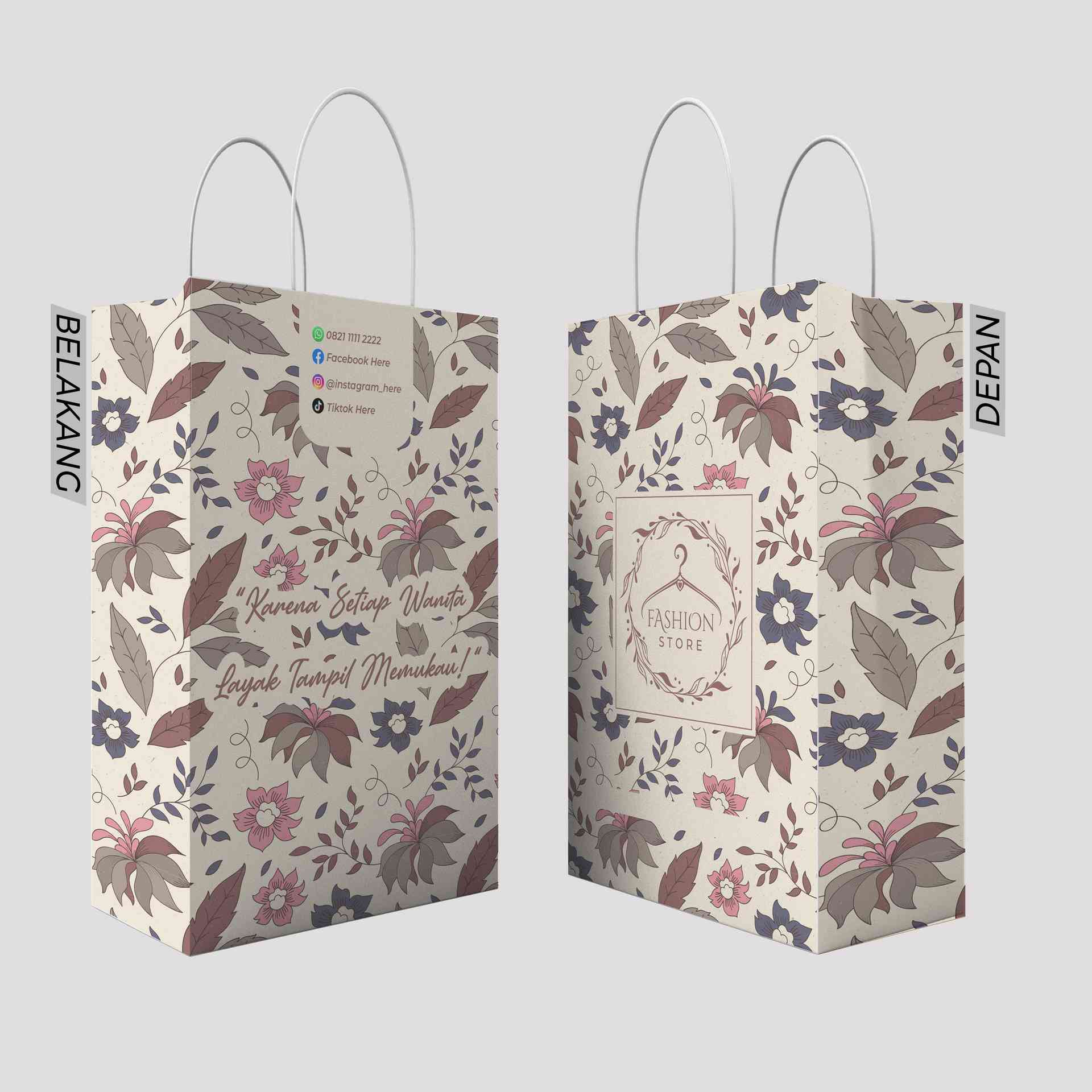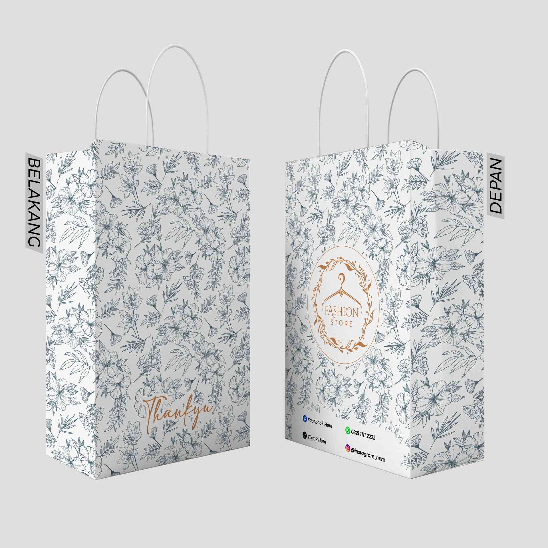 Gambar ini menampilkan desain paper bag eksklusif dari "Fashion Store" dengan tampilan minimalis dan elegan. Warna dasar putih dengan motif halus memb...