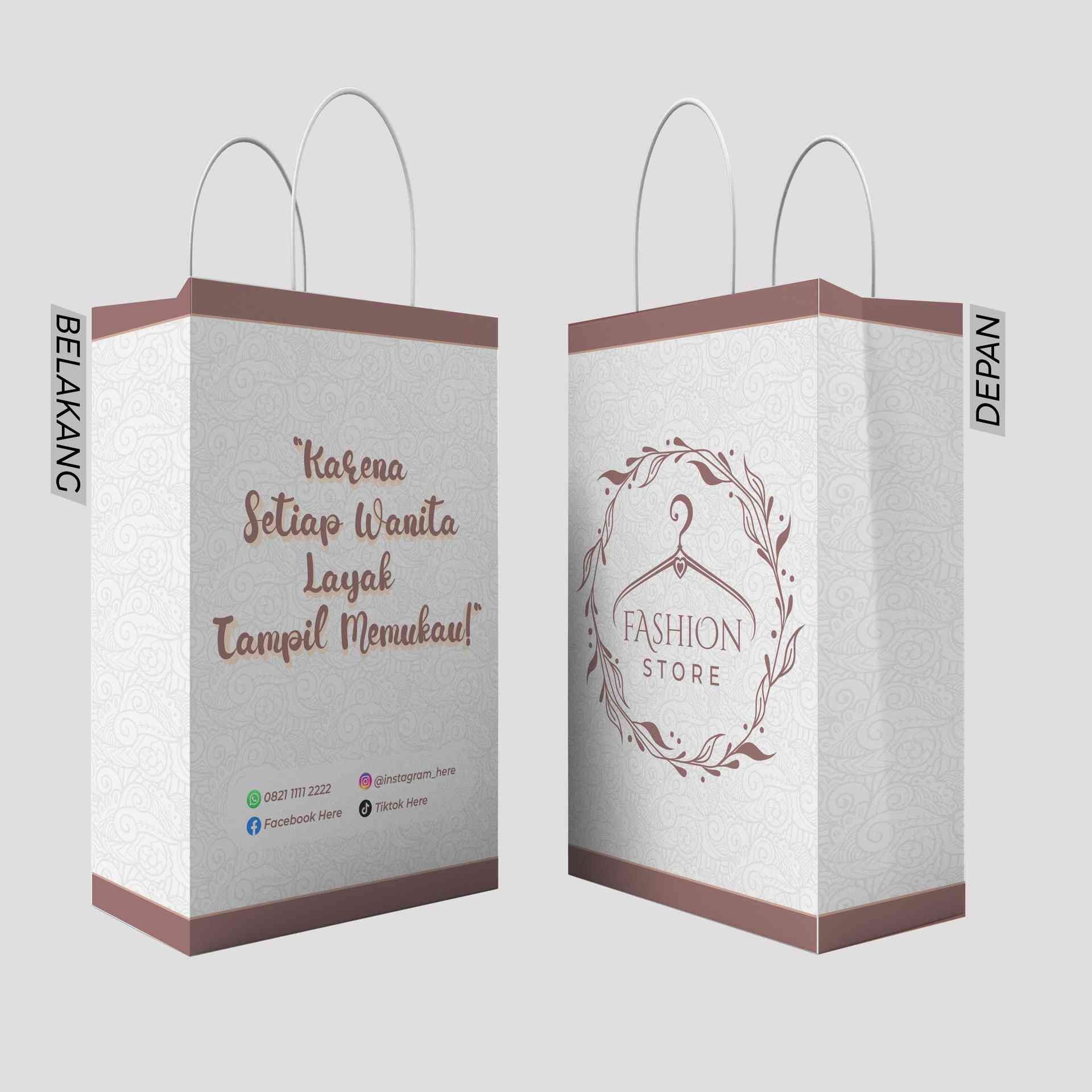 Gambar ini menampilkan desain paper bag eksklusif dari Fashion Store, yang mengusung warna putih dengan sentuhan cokelat elegan. Motif swirl halus di...