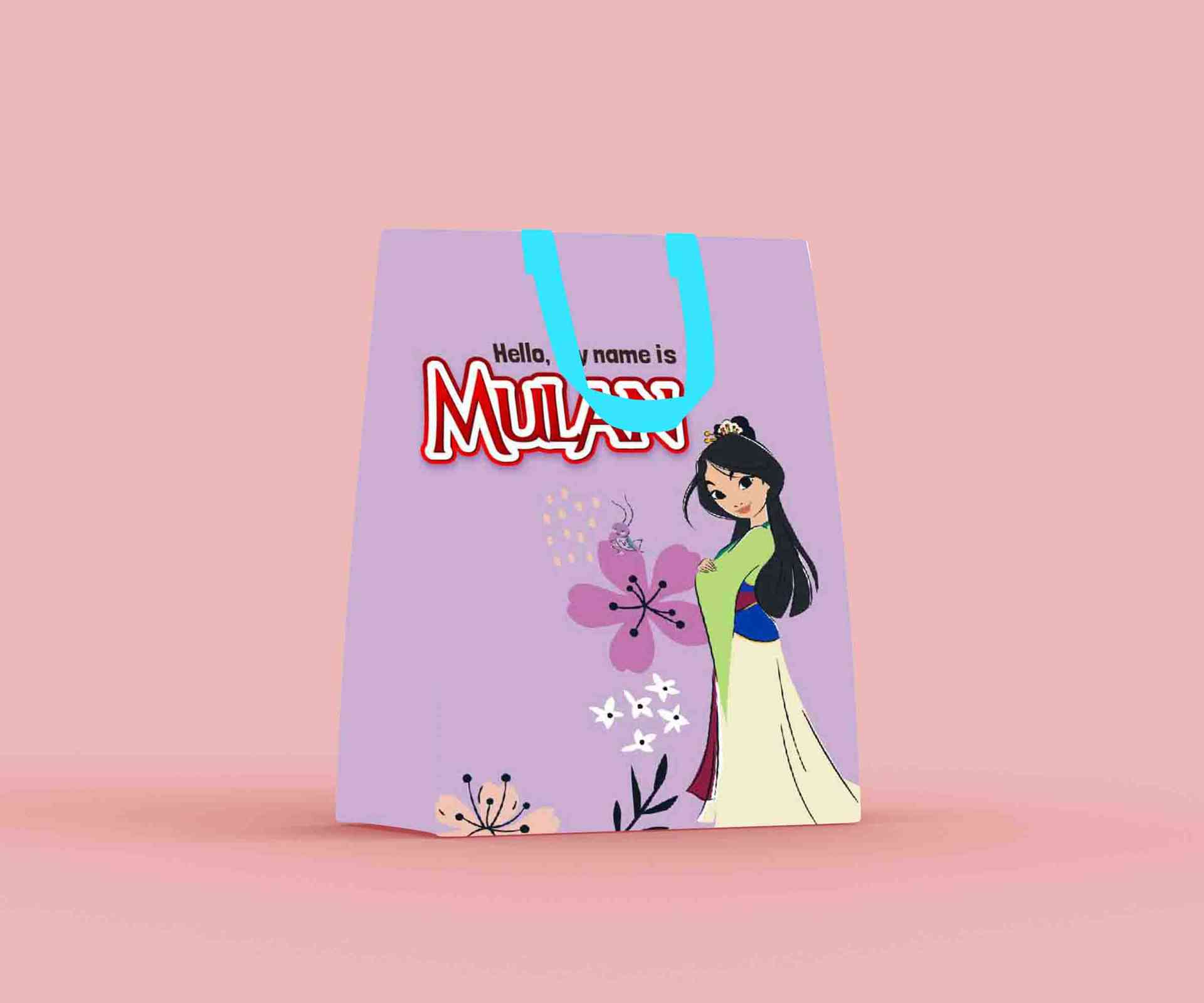 Paper bag ini memadukan karakter Mulan yang anggun dan pemberani dalam desain ulang tahun yang lembut dan elegan. Latar belakang ungu pastel dihiasi b...