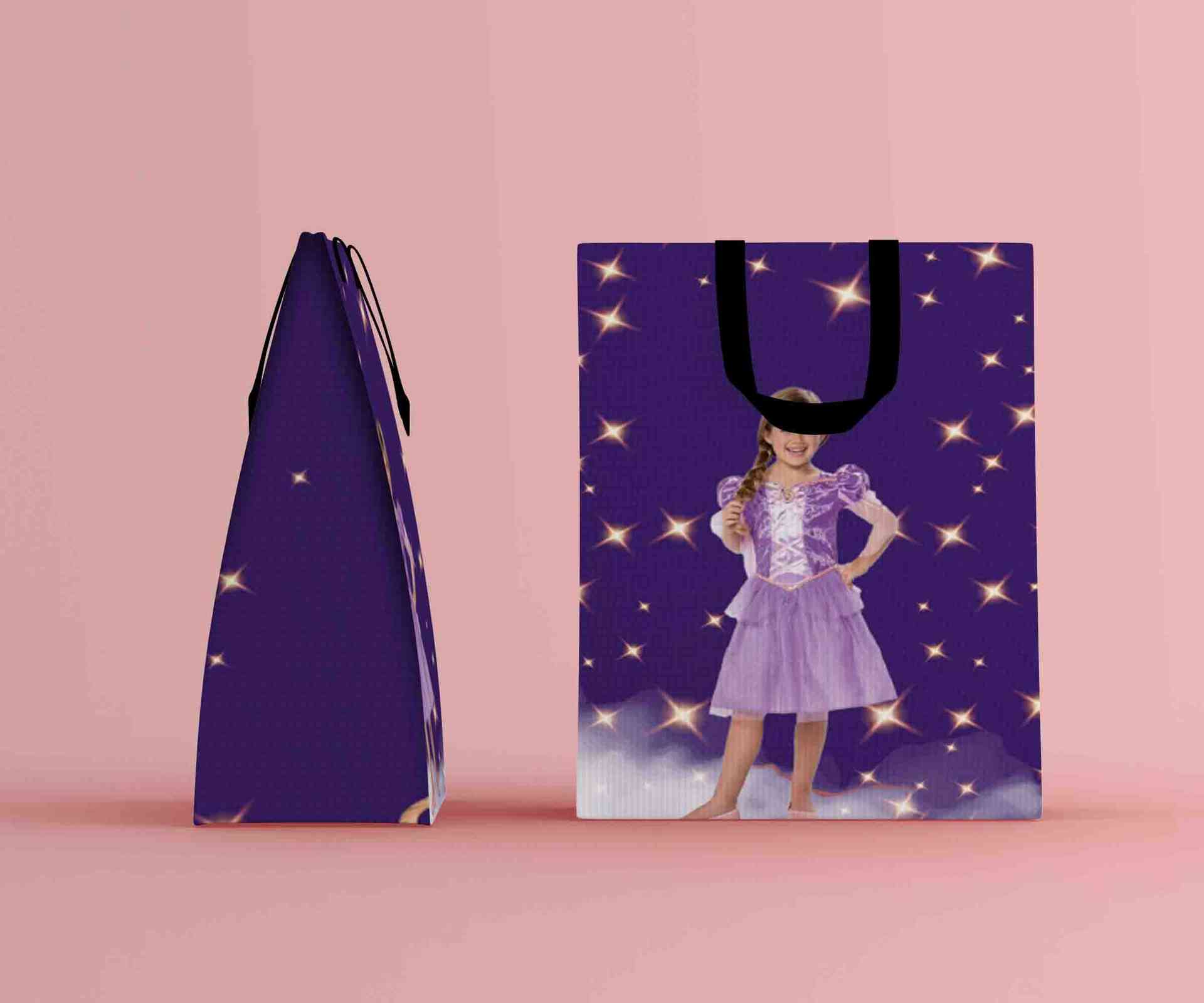 Paper bag ulang tahun bertema Rapunzel ini berbentuk persegi panjang dengan nuansa ungu yang dominan sebagai latar, dihiasi bintang-bintang kuning yan...
