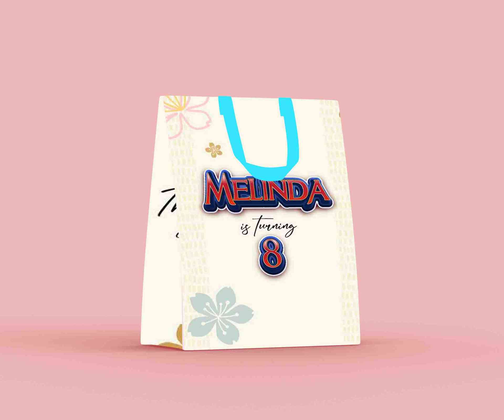 Paper bag ini didesain khusus untuk ulang tahun anak bertema Peppa Pig dengan nuansa langit cerah dan pelangi yang memancarkan keceriaan. Di bagian depan terdapat nama anak "Fileen" dan usia "5" yang diletakkan tepat di bawah lengkungan pelangi, dikelilingi karakter Peppa dan teman-temannya yang duduk di atas awan dan bukit hijau. Elemen awan, bintang, dan bunga kecil tersebar harmonis memberikan kesan lembut dan bahagia. Bagian belakang menampilkan karakter tambahan dari serial yang sama, termasuk Peppa dalam kostum peri dengan tongkat bintang, menciptakan suasana dongeng yang menggemaskan dan imajinatif. Warna-warna pastel biru, hijau, pink, dan kuning dipadukan secara seimbang untuk menarik perhatian anak-anak sekaligus memberikan kesan hangat dan menyenangkan.