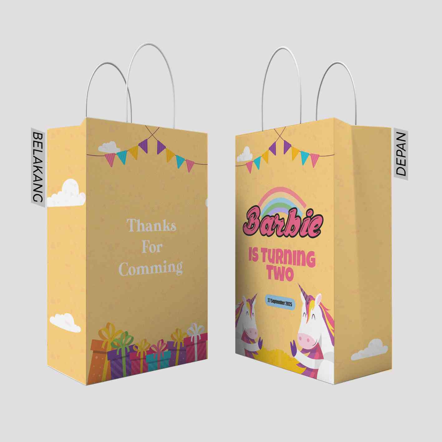 Kantong kado berwarna kuning ini memiliki tema yang sangat cerah dan menyenangkan, dengan ilustrasi unicorn yang menambah kesan fantasi pada desainnya...