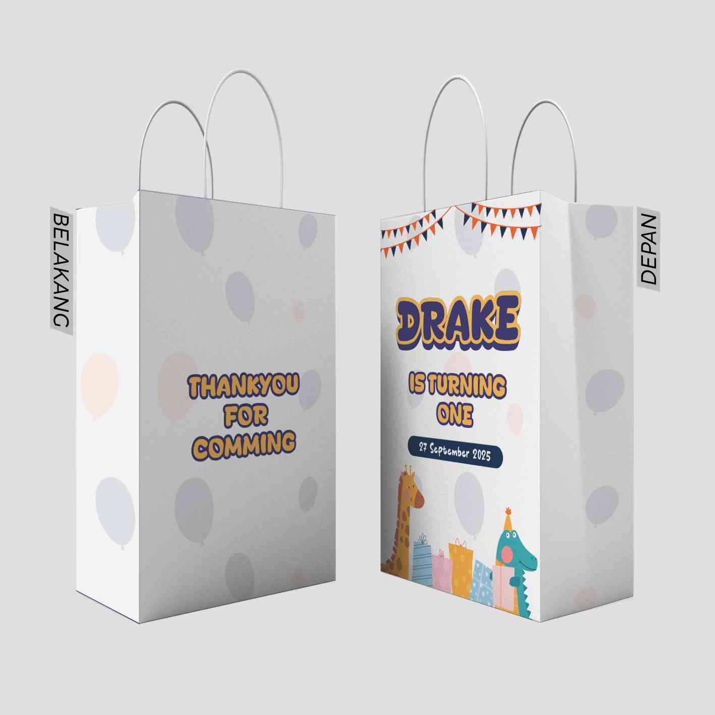 Desain tas kertas untuk acara ulang tahun dengan tema ceria, yang menampilkan elemen seperti balon dan karakter lucu seperti dinosaurus dan jerapah. B...