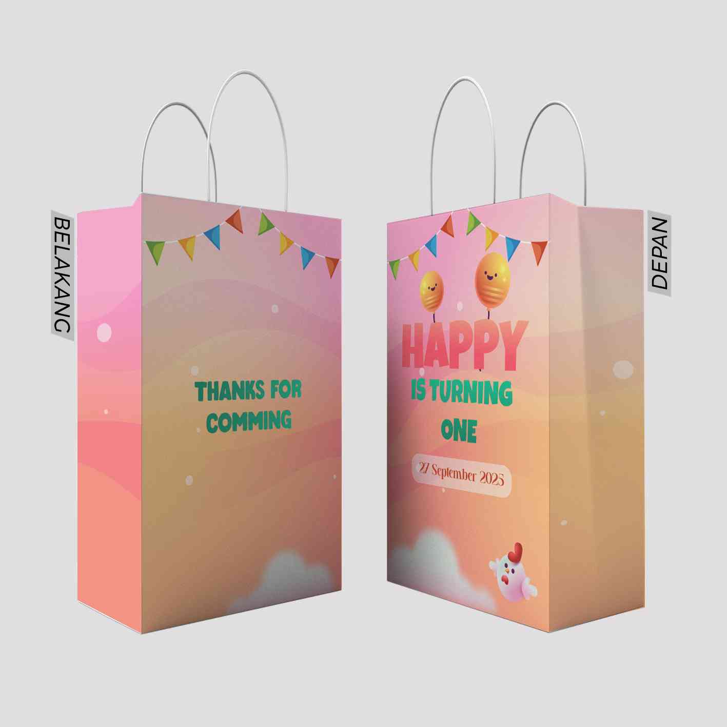 Kantong kado ini menggunakan tema warna pink yang lembut dengan elemen-elemen yang sangat ceria. Di bagian belakang kantong, terdapat tulisan "THANK YOU FOR COMMING" yang diwarnai dengan warna cerah dan dihiasi dengan confetti berwarna-warni, memberikan kesan menyenangkan bagi yang menerimanya. Bagian depan kantong menampilkan tulisan besar "Helen's is Turning One" yang dipadukan dengan ilustrasi kue ulang tahun berwarna cerah, hadiah, serta dekorasi perayaan lainnya. Tema ini memberikan kesan girly dan penuh kegembiraan, cocok untuk merayakan ulang tahun pertama Helen. Desain yang simpel namun menarik ini juga membuat kantong ini terlihat elegan sekaligus ceria.