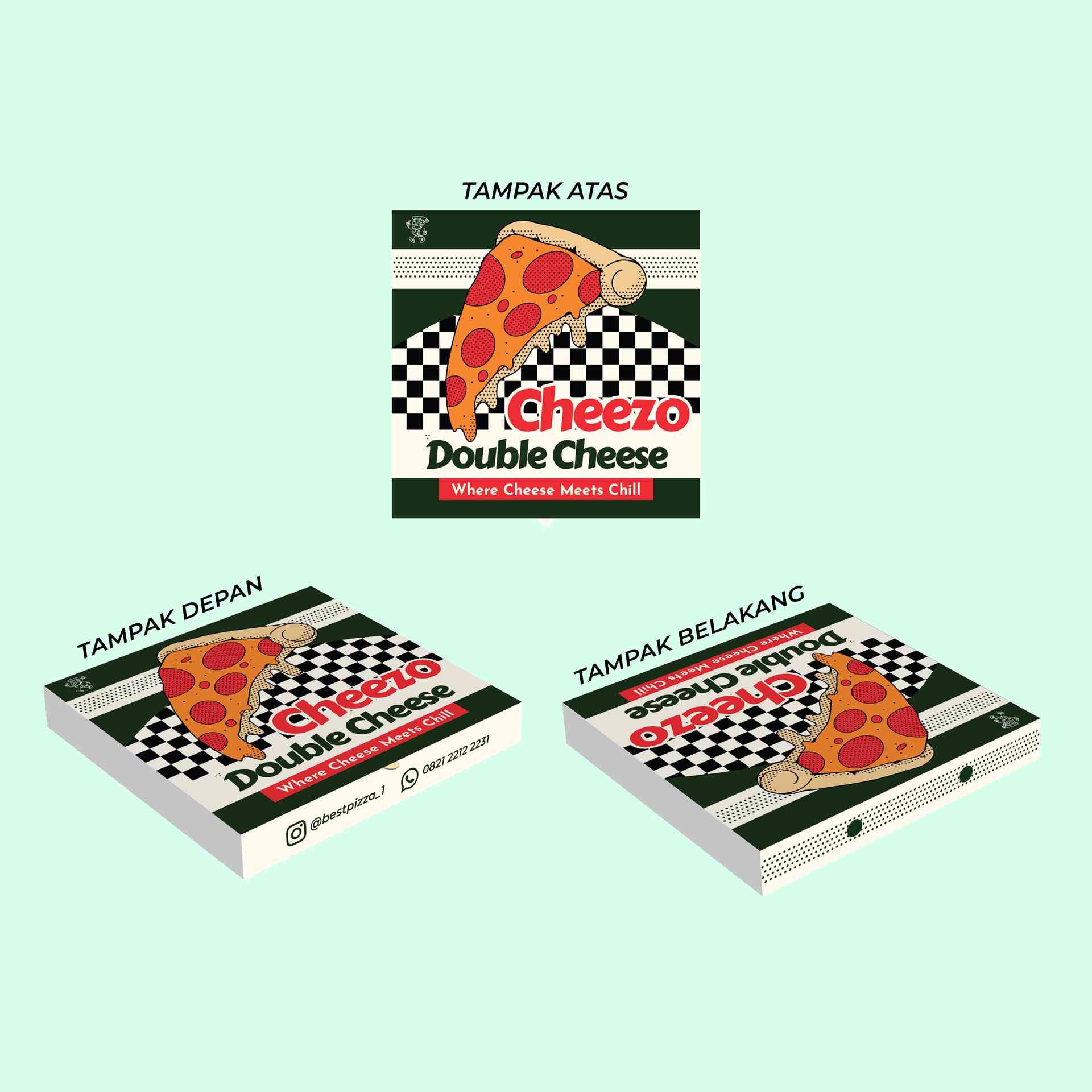 Desain kotak pizza “Cheezo Double Cheese” menampilkan identitas visual yang playful dan kuat. Dengan dominasi warna hitam dan putih dalam pola kotak-k...