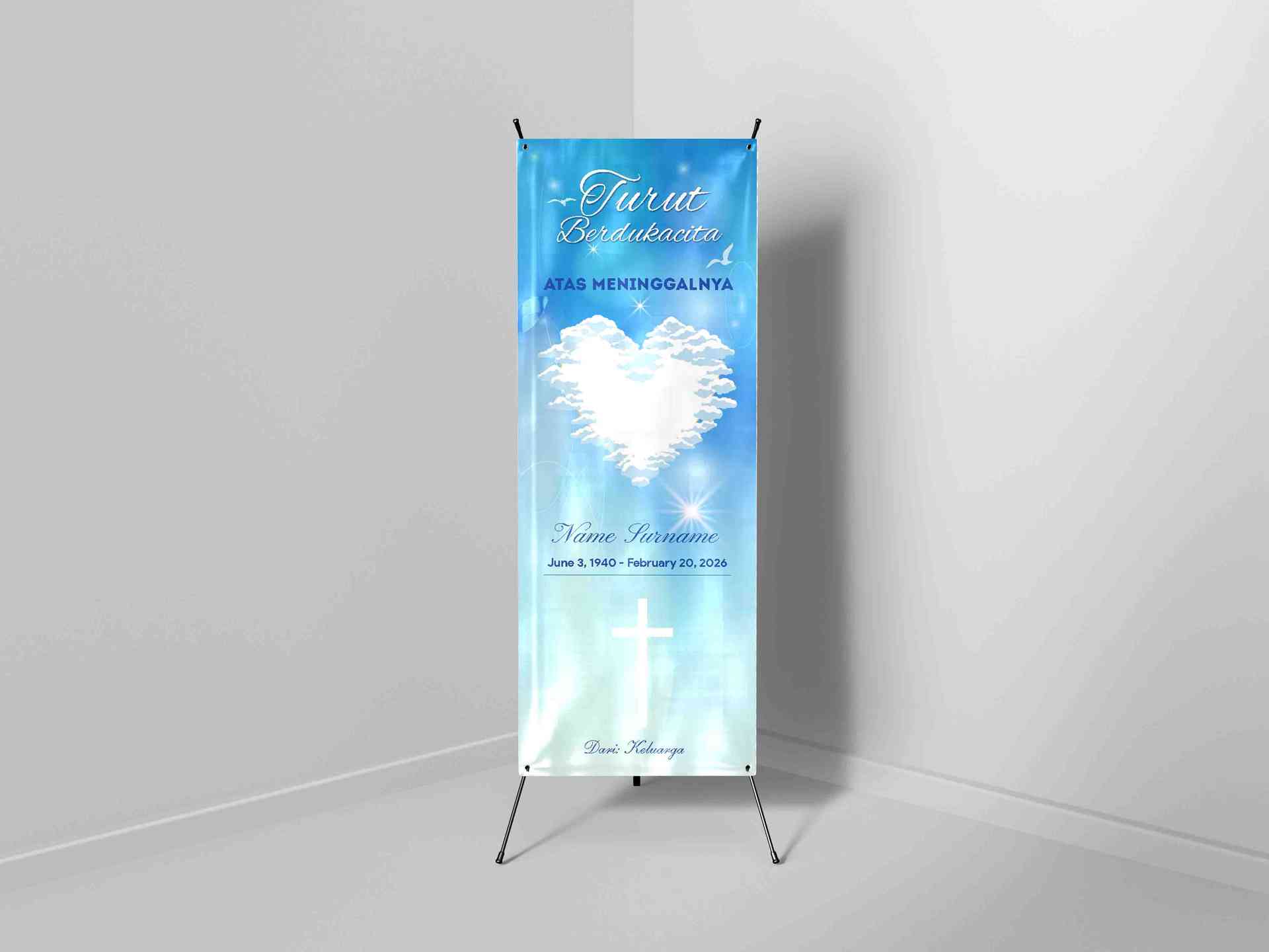 Desain X-Banner ini menghadirkan nuansa damai dan surgawi, sangat cocok untuk menyampaikan belasungkawa secara lembut dan penuh harapan. Latar belakan...