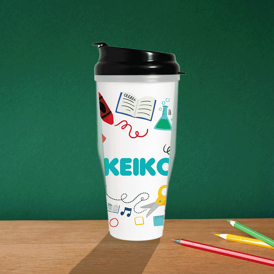 Tumbler Insert Karakter Anak Sekolah berbentuk silinder dengan tutup flip berwarna hitam, didominasi warna putih pada permukaan utama yang dihiasi ilu...