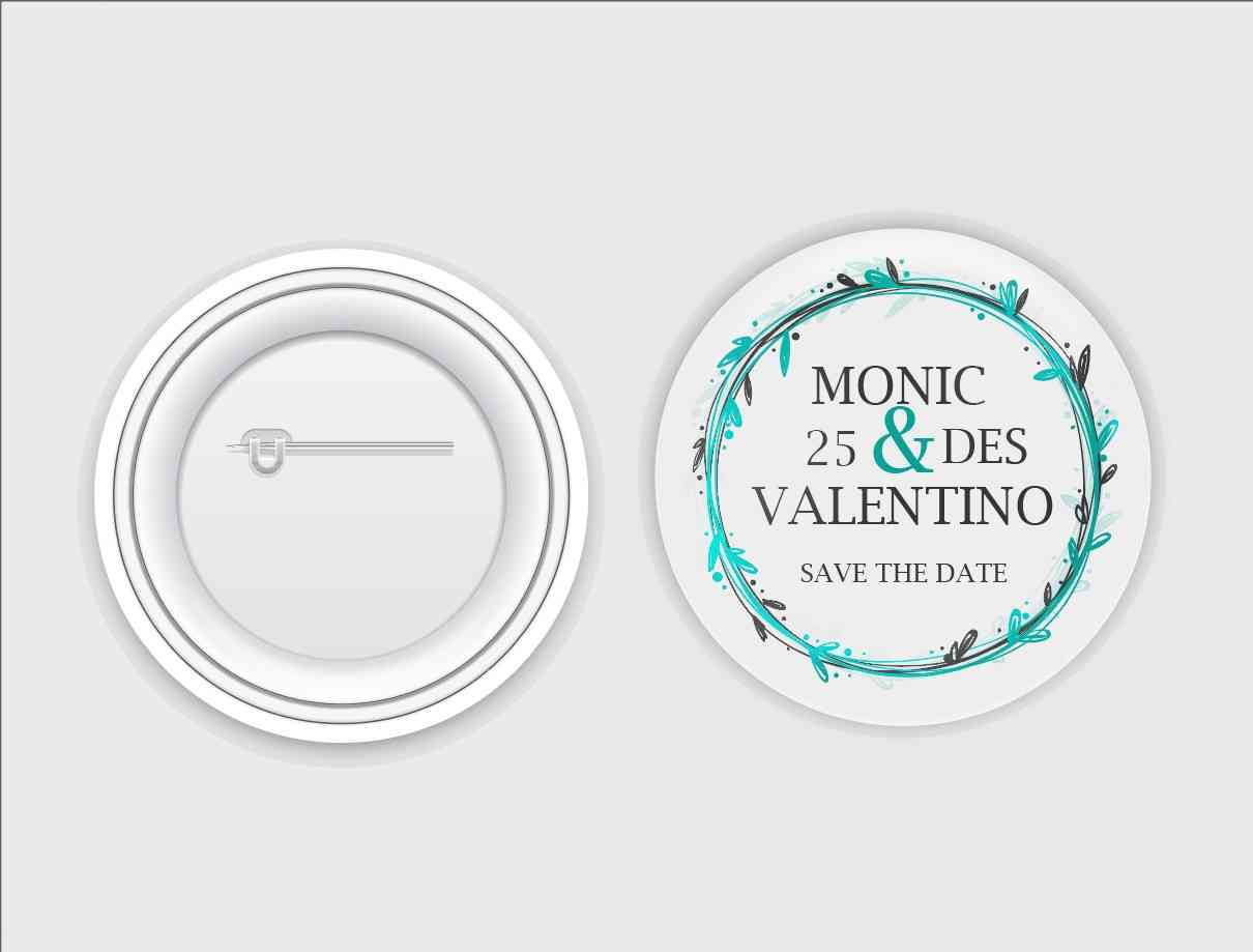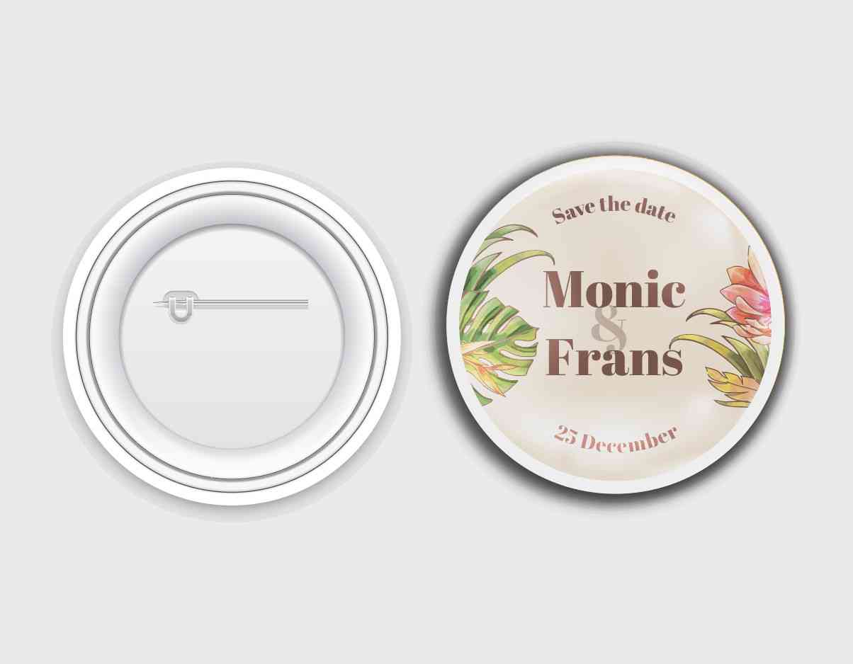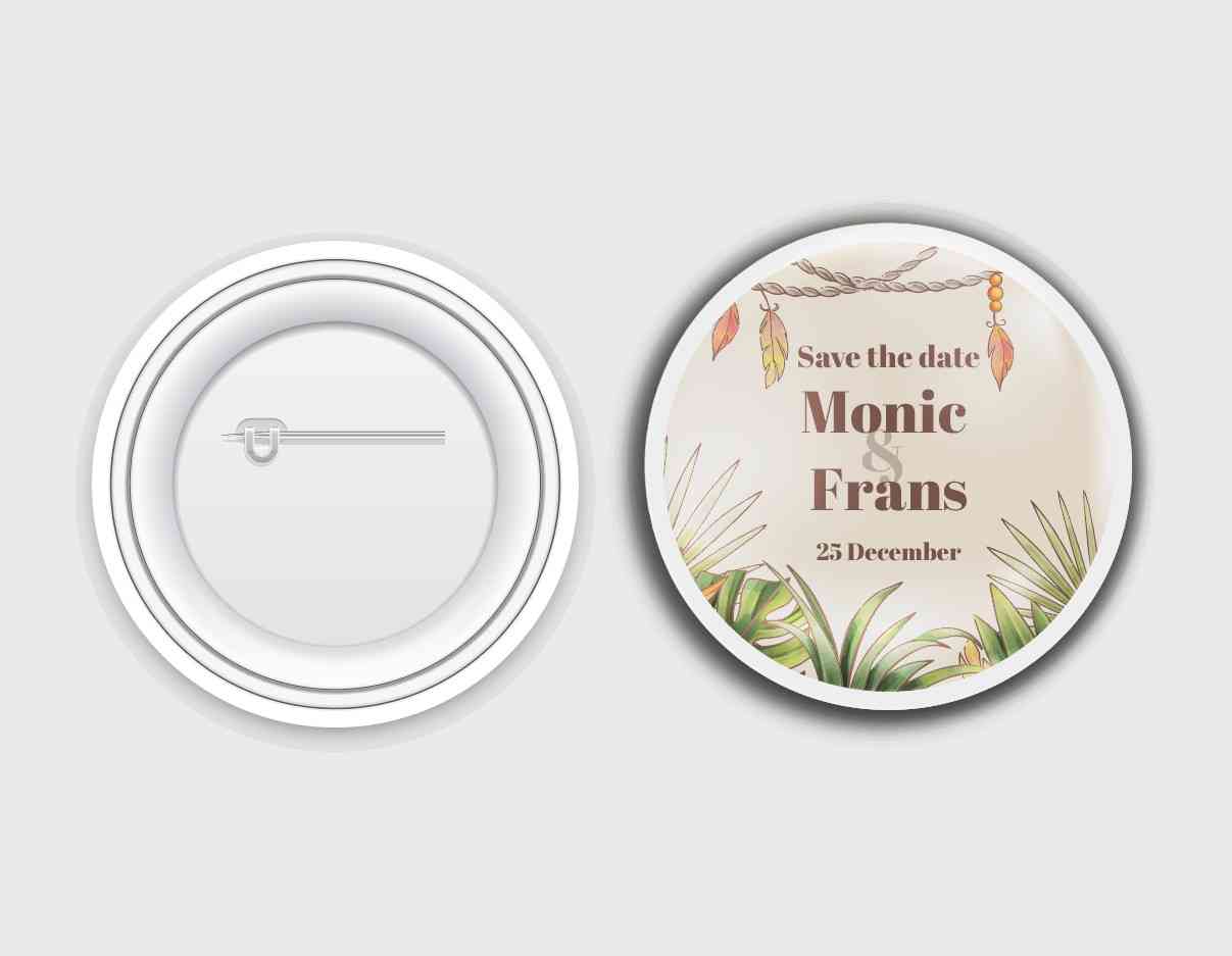 Pin pernikahan ini dirancang dengan konsep elegan dan penuh warna untuk menyambut hari bahagia. Dengan kombinasi warna yang cerah dan segar, pin ini menonjolkan teks "Save The Date" dan "Happy Marriage" di sekeliling desain, memberikan kesan yang modern dan menyenangkan. Bagian tengah menampilkan nama pasangan, dengan hiasan ilustrasi daun tropis yang menambah kesan alami dan romantis. Pin ini sangat cocok sebagai souvenir pernikahan yang unik dan penuh makna.