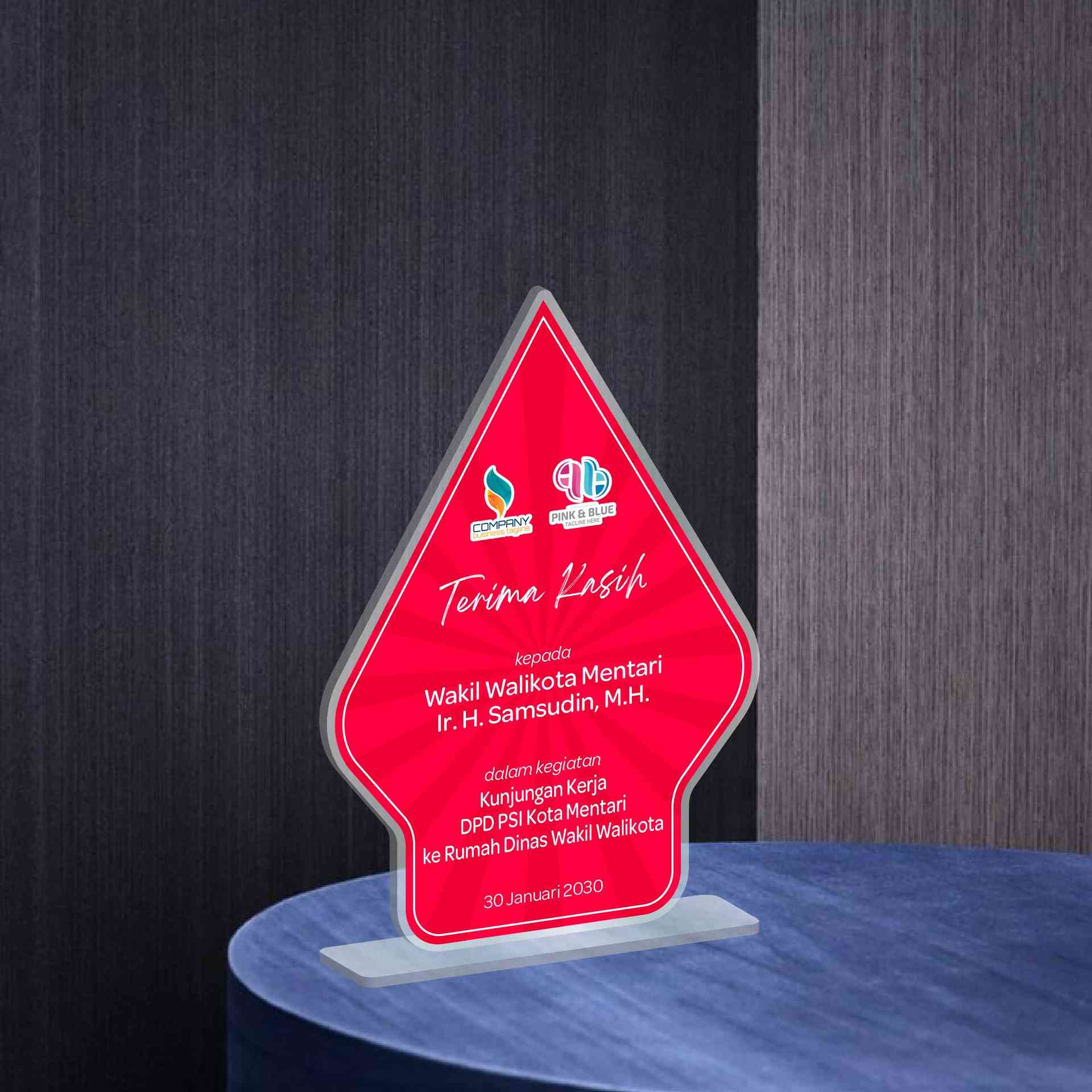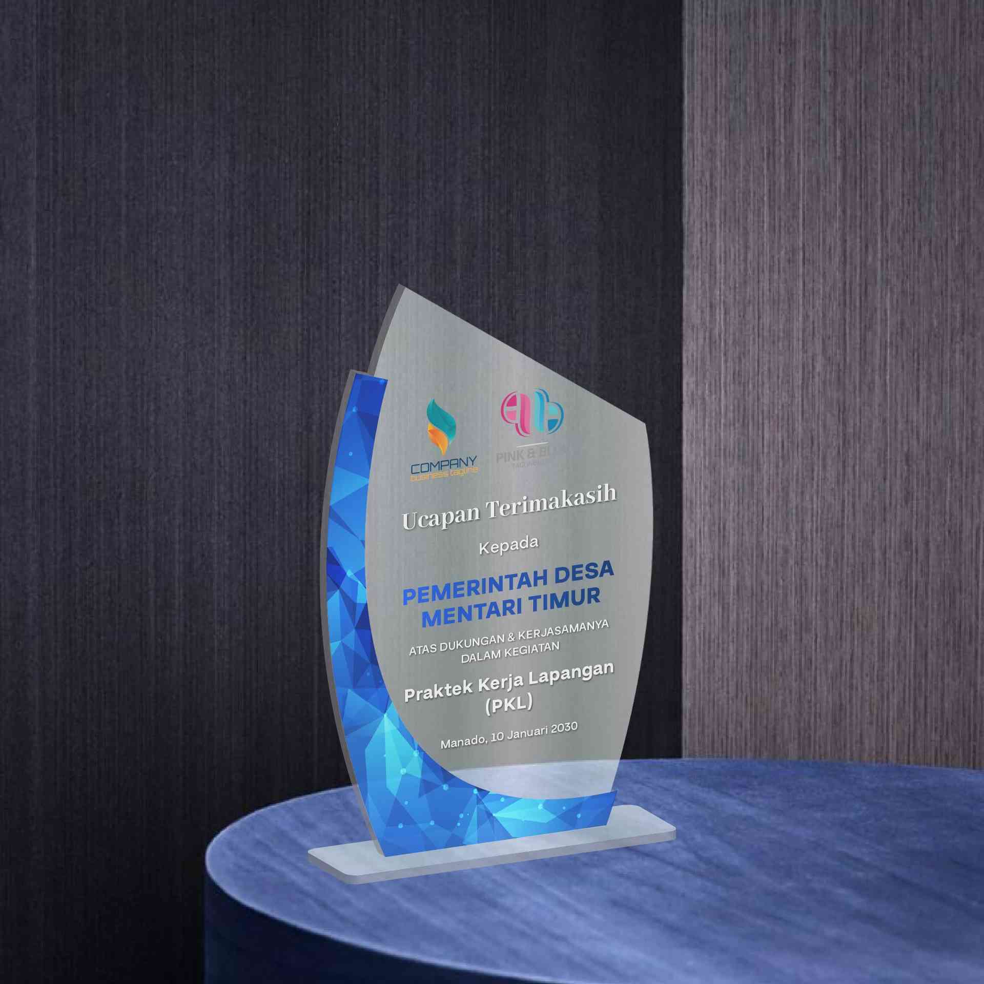 Plakat akrilik penghargaan ini memiliki desain yang elegan dan modern, dengan bentuk melengkung yang unik serta material akrilik berkualitas tinggi ya...