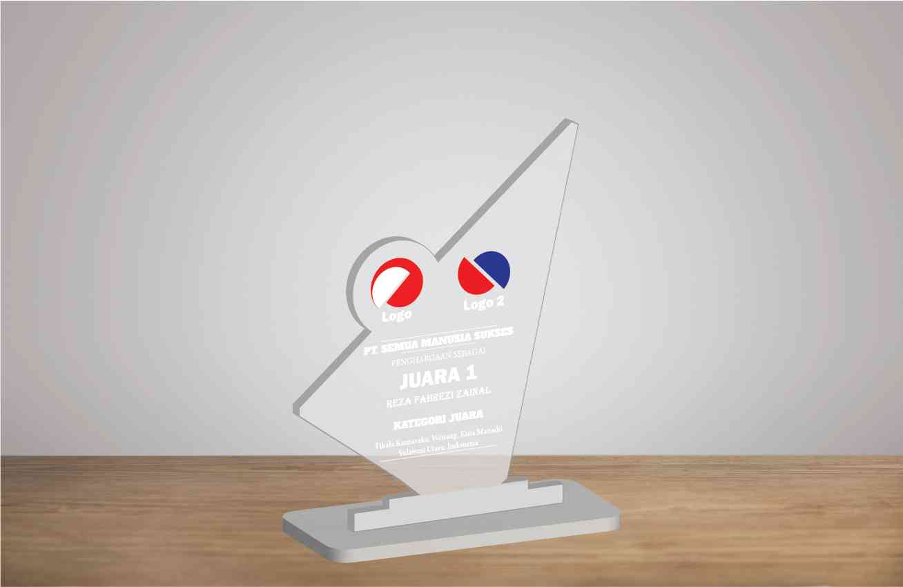 Plakat akrilik ini memiliki desain geometris modern dengan potongan asimetris yang memberikan kesan eksklusif dan elegan. Terbuat dari akrilik premium dengan ketebalan ideal, plakat ini cocok digunakan sebagai trofi penghargaan, hadiah juara, atau kenang-kenangan prestisius untuk berbagai acara kompetisi dan perayaan.