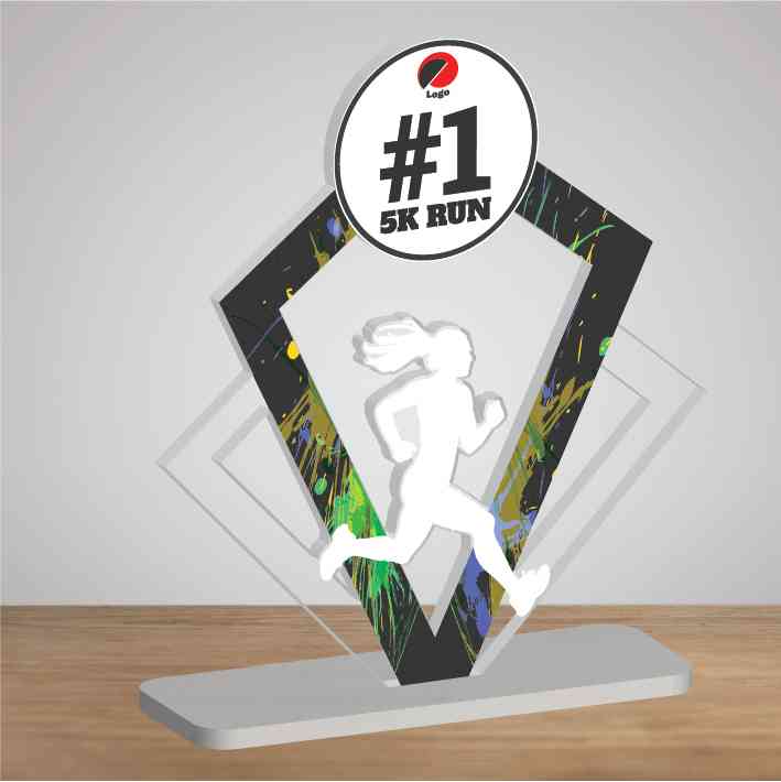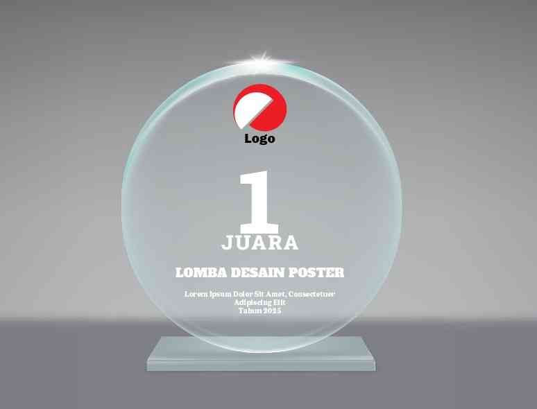 Plakat penghargaan lomba lari marathon dengan desain elegan berbahan akrilik transparan, menampilkan bentuk unik dengan elemen grafis modern. Diberika...