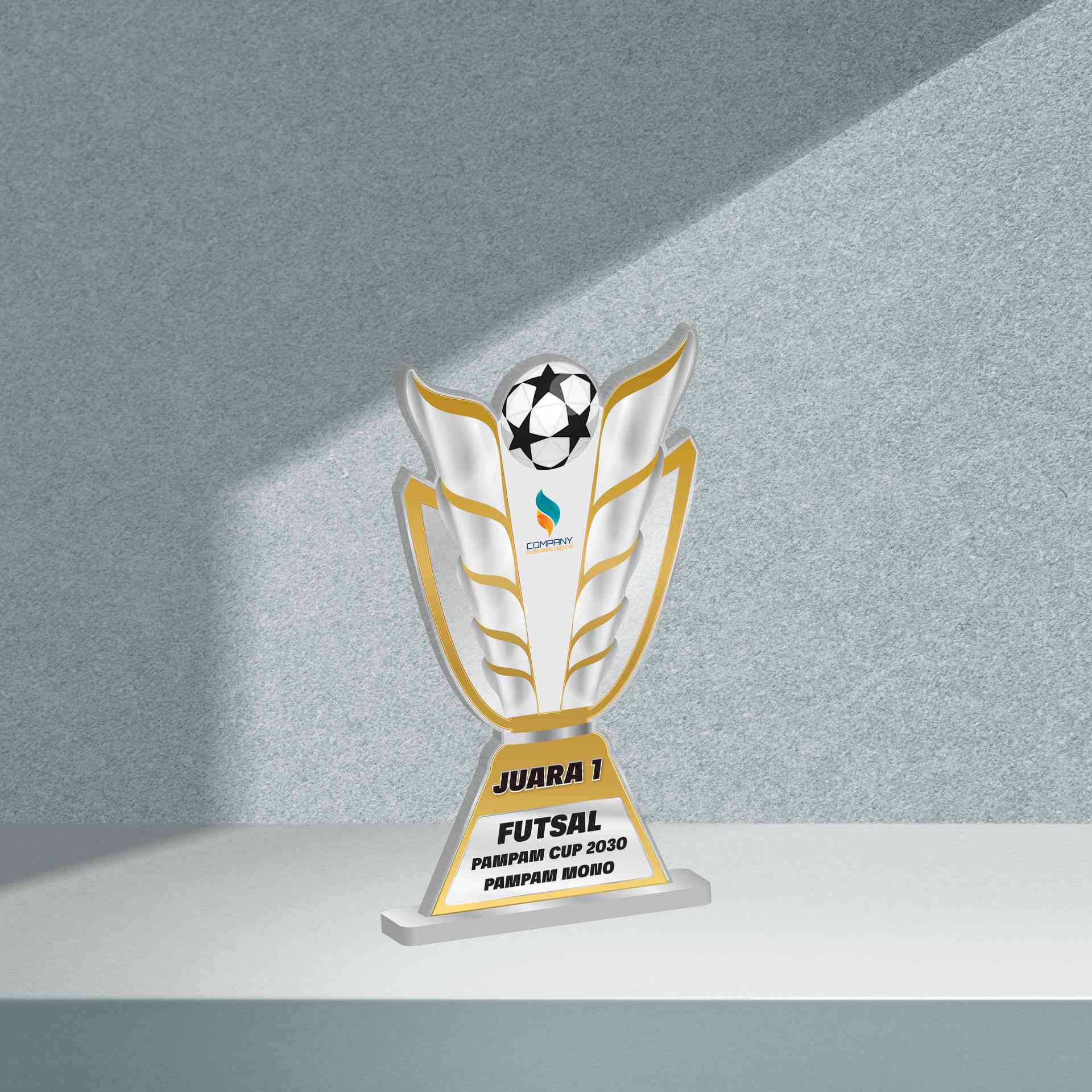 Plakat akrilik trophy juara lomba futsal / bola kaki ini memiliki desain yang elegan dan modern dengan kombinasi warna perak dan emas yang memberikan...