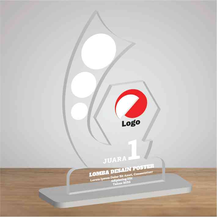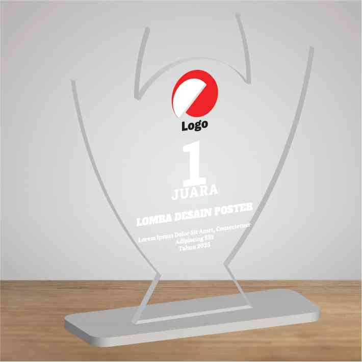 Plakat penghargaan dengan desain elegan berbahan akrilik transparan, menampilkan bentuk unik dengan elemen grafis modern. Diberikan sebagai trofi juar...