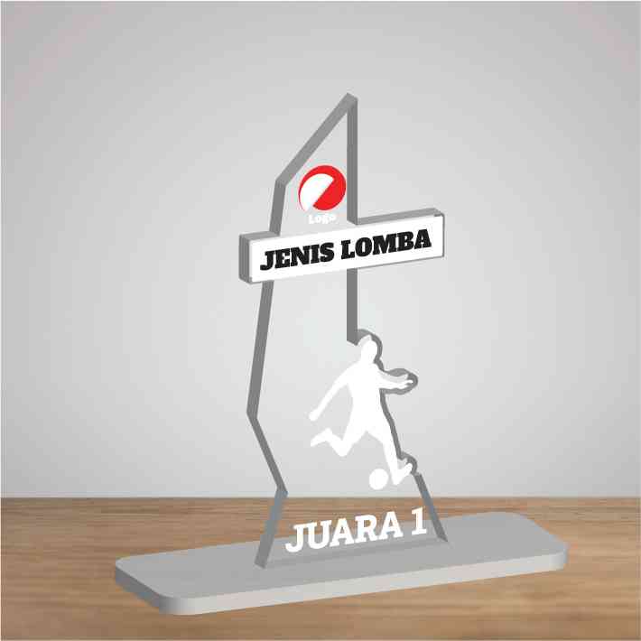 Plakat penghargaan lomba Sepak Bola dengan desain elegan berbahan akrilik transparan, menampilkan bentuk unik dengan elemen grafis modern. Diberikan s...
