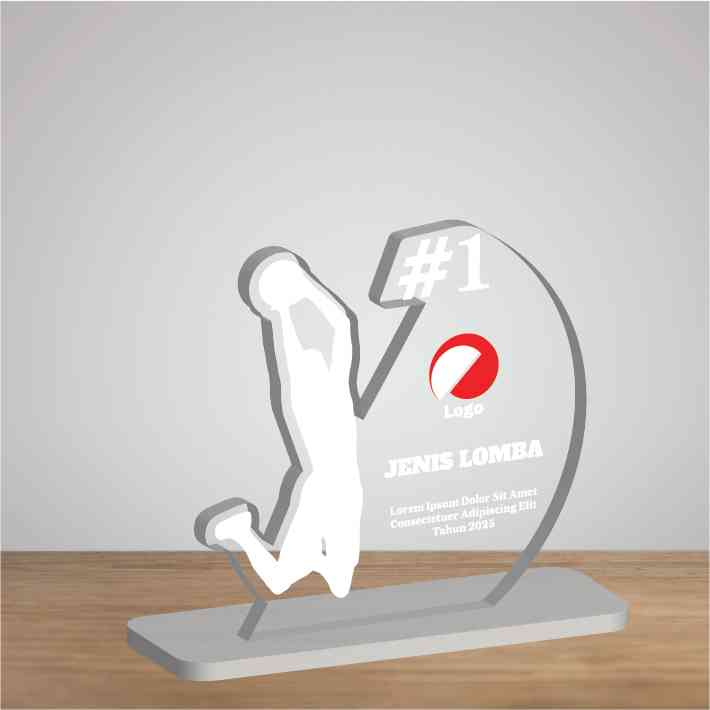 Plakat penghargaan lomba basket dengan desain elegan berbahan akrilik transparan, menampilkan bentuk unik dengan elemen grafis modern. Diberikan sebag...