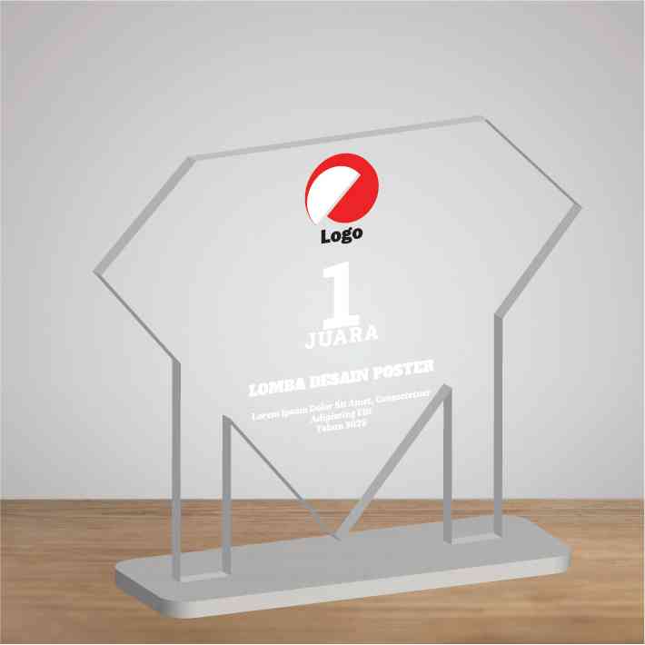 Plakat penghargaan dengan desain unik berbentuk kaos, terbuat dari bahan akrilik transparan dengan dudukan berbasis logam. Didesain untuk juara pertam...