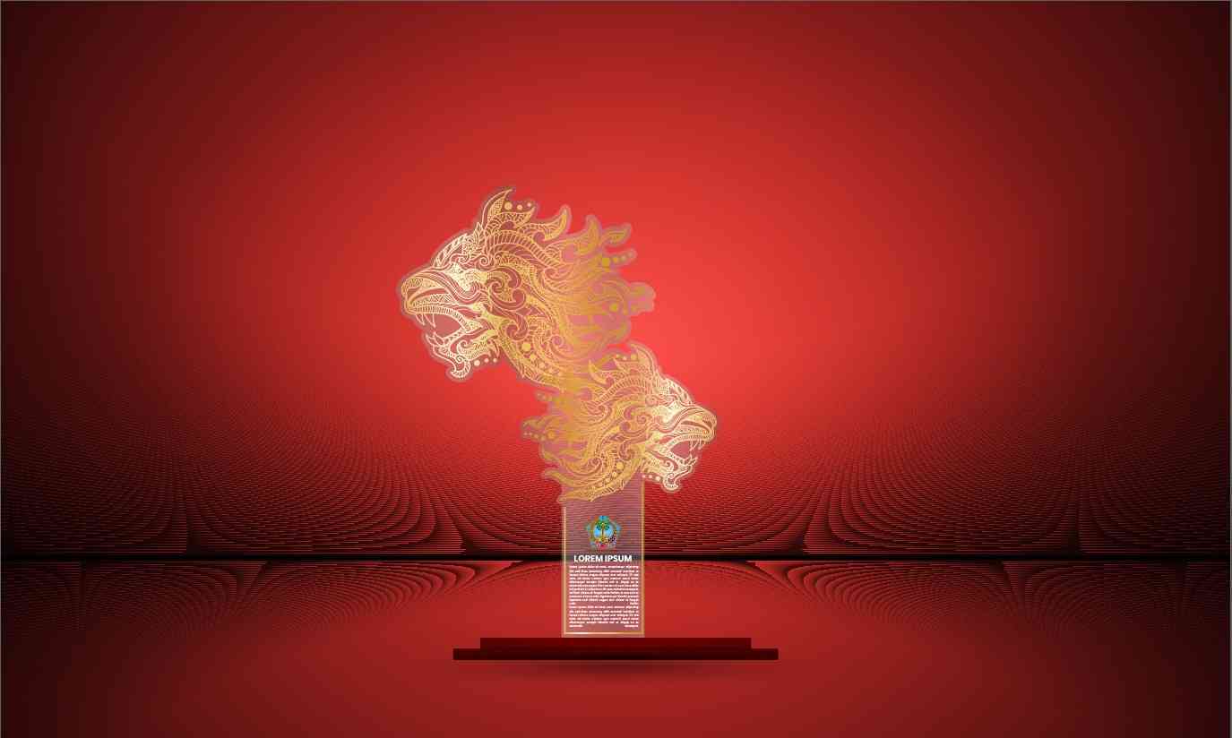 Plakat piagam penghargaan acrylic berbentuk persegi panjang dengan bagian atas dihiasi ornamen kepala singa bergaya ukiran emas yang dinamis dan artis...