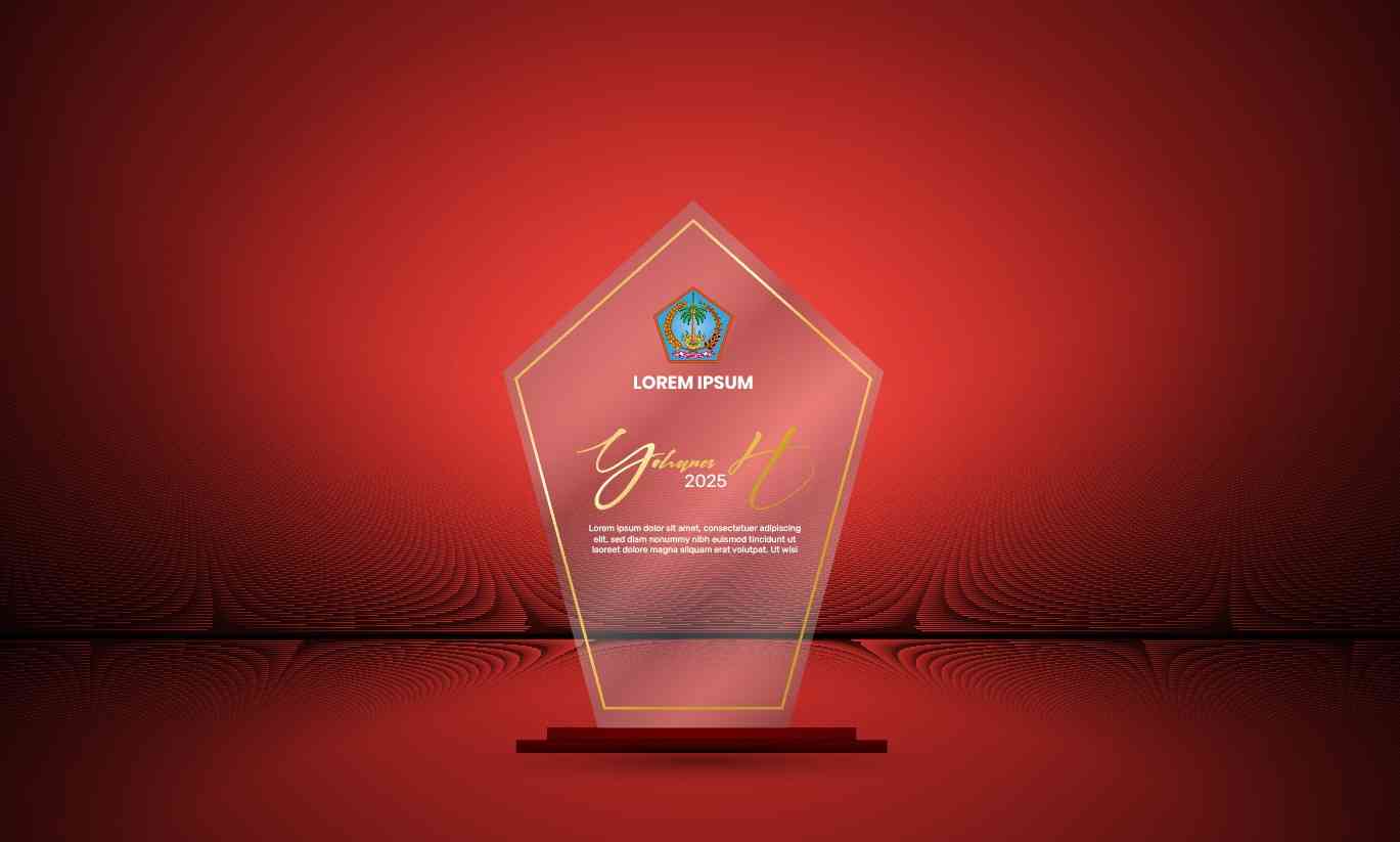 Plakat piagam penghargaan berbahan acrylic ini memiliki bentuk pentagon dengan tepi berwarna emas yang elegan, menampilkan karakter formal melalui ele...