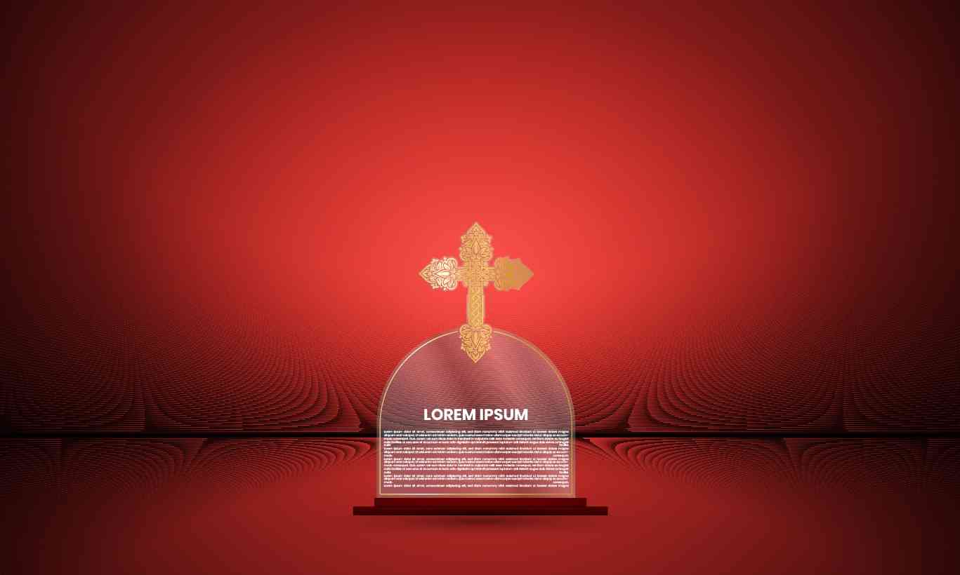 Plakat piagam penghargaan acrylic berbentuk setengah lingkaran dengan tambahan ornamen salib emas beraksen dekoratif pada bagian atas, menonjol sebaga...