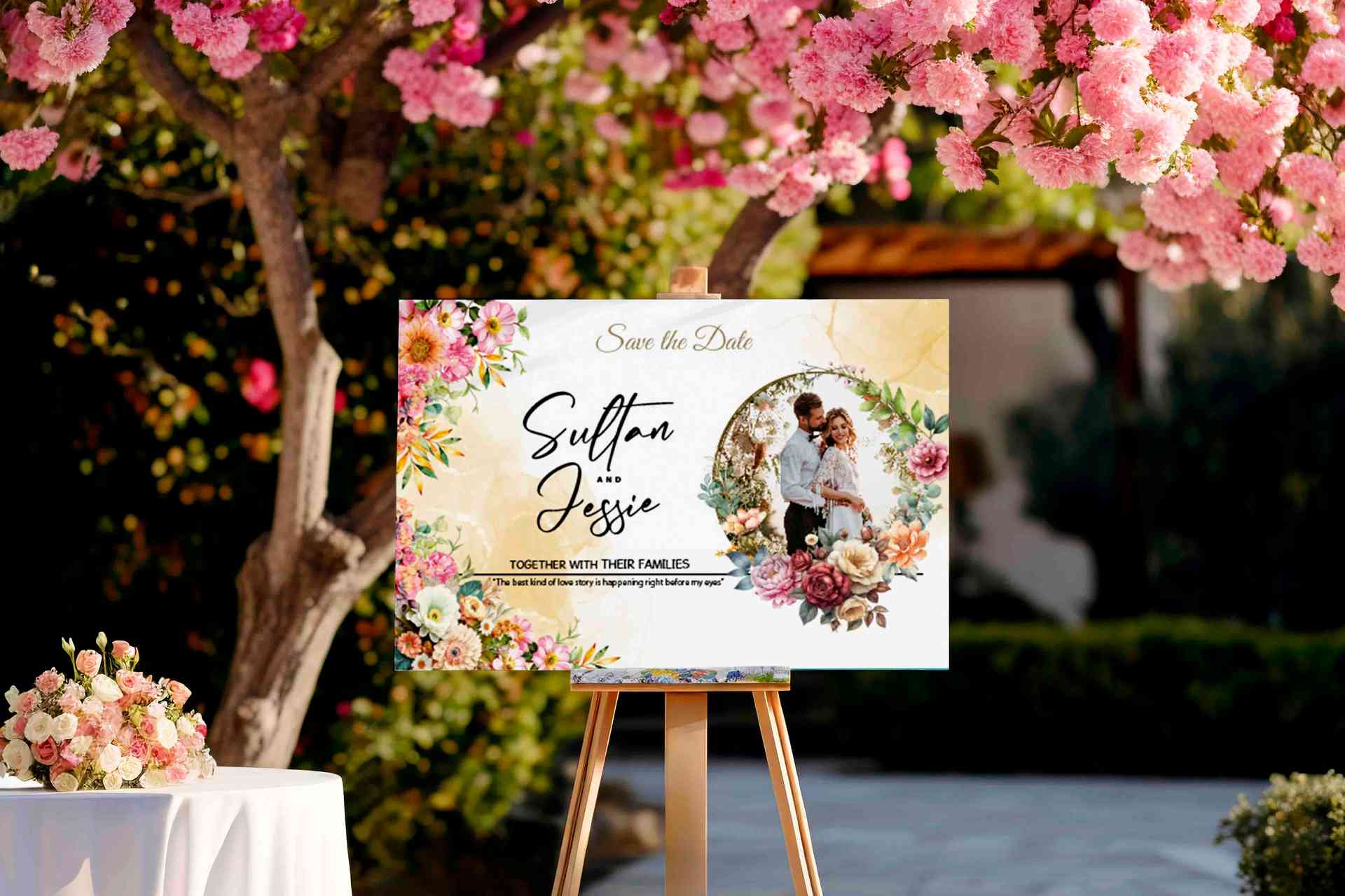 Desain wedding sign ini menampilkan keanggunan yang memikat dengan latar bernuansa marble gold dan floral artistik di sisi kiri dan kanan. Di tengah d...