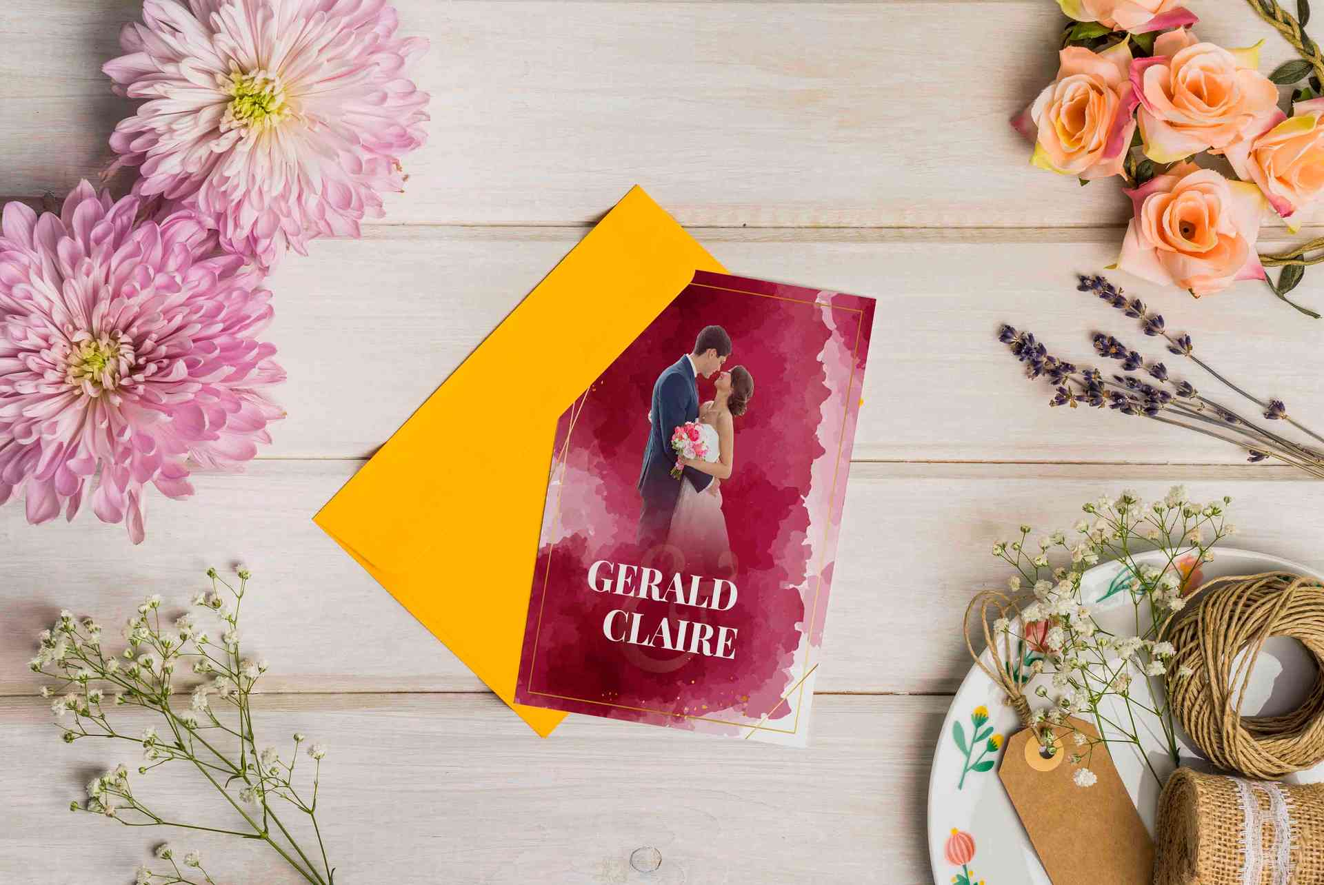 Undangan pernikahan dengan nuansa merah maroon dan gold ini menampilkan foto pasangan pengantin sebagai fokus utama, didukung nama mempelai dalam tipo...