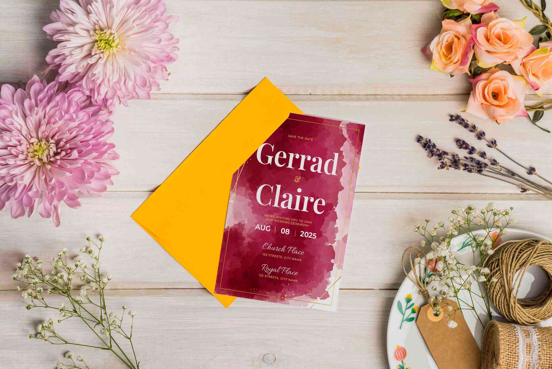 Plat wedding ini menampilkan desain yang ceria dan penuh warna, dengan tema bunga tropis yang mengelilingi sisi kiri dan kanan. Nama pasangan “James ♥...