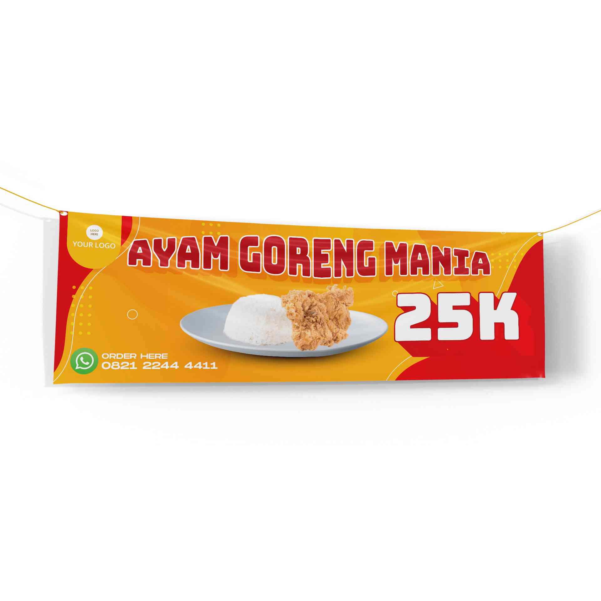 Spanduk ini memadukan nuansa hijau alami dan aksen kuning cerah, menampilkan foto ayam goreng dan sayuran di sisi kiri yang menggoda. Teks “25K” dicet...