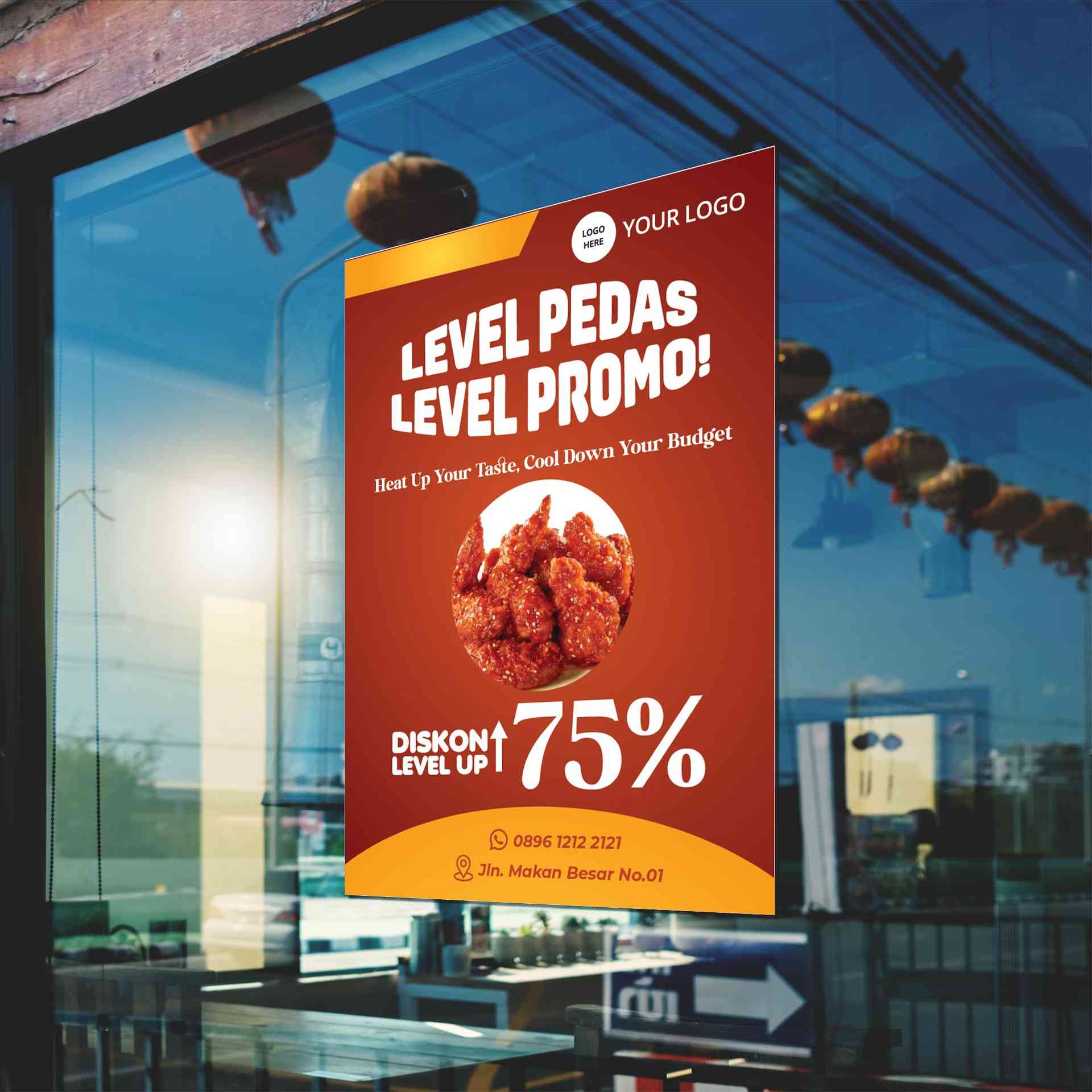 Dengan warna merah menyala dan visual ayam goreng pedas, poster ini langsung menggugah semangat para pencinta makanan pedas. Ditambah promo diskon sam...