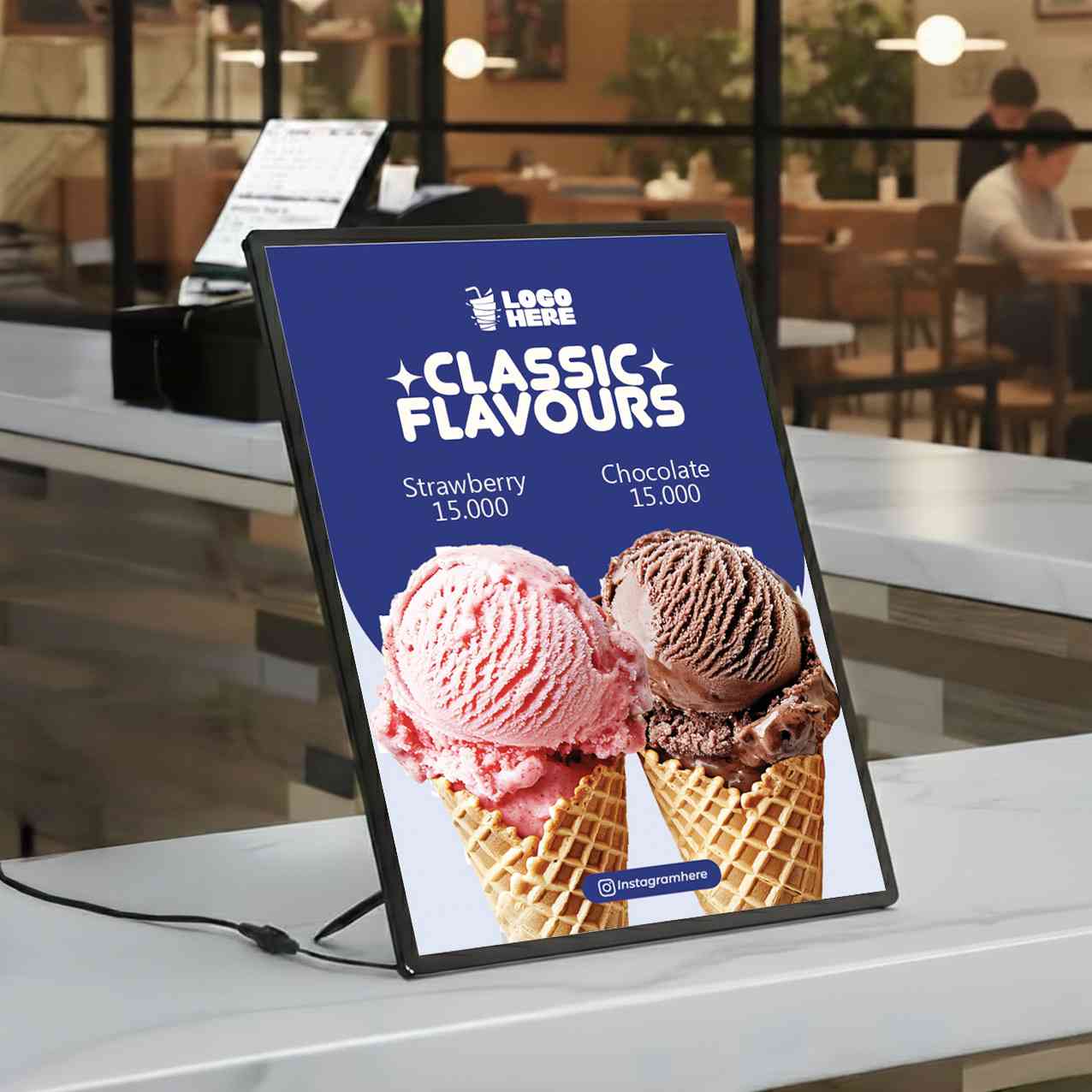 Slim LED Menu dengan tema Ice Cream Cone 2 Rasa ini berbentuk persegi panjang ramping dengan tampilan visual yang mencolok, menampilkan gambar soft ic...
