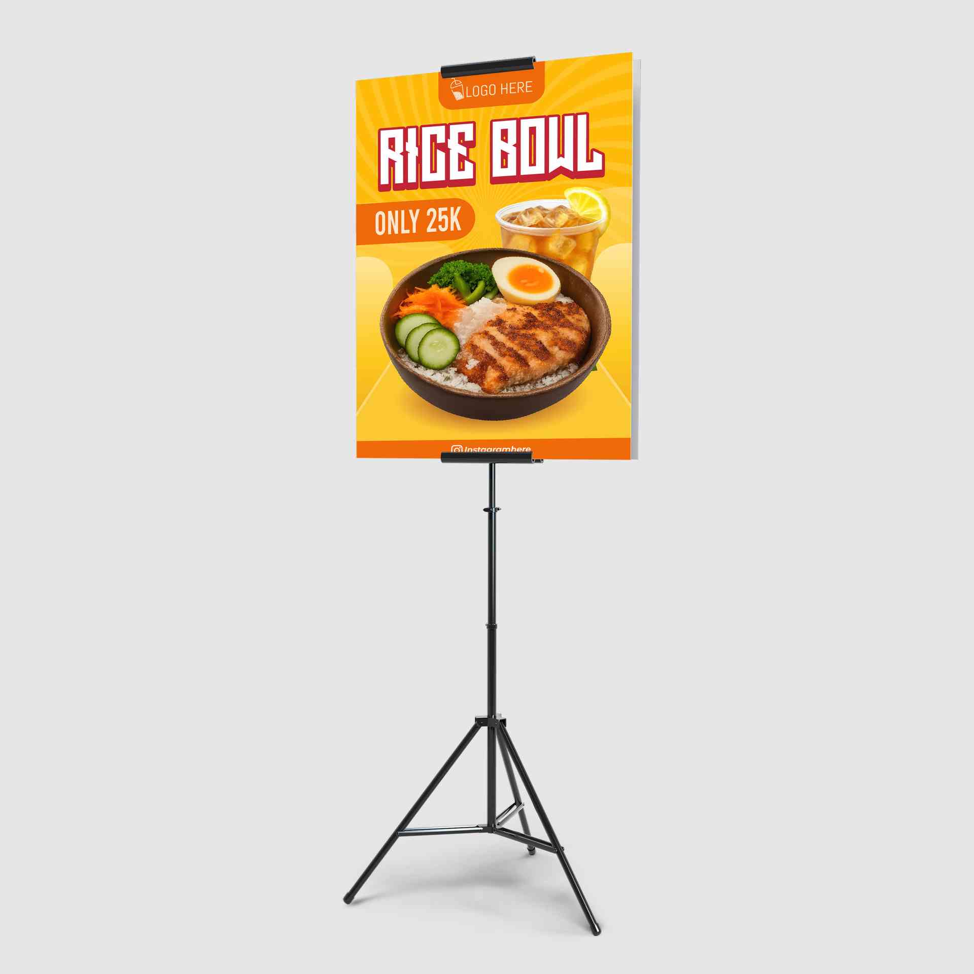 Foamboard promo bertuliskan “Rice Bowl” ini berbentuk persegi panjang vertikal dengan desain warna dominan kuning dan oranye yang mencolok. Visual uta...