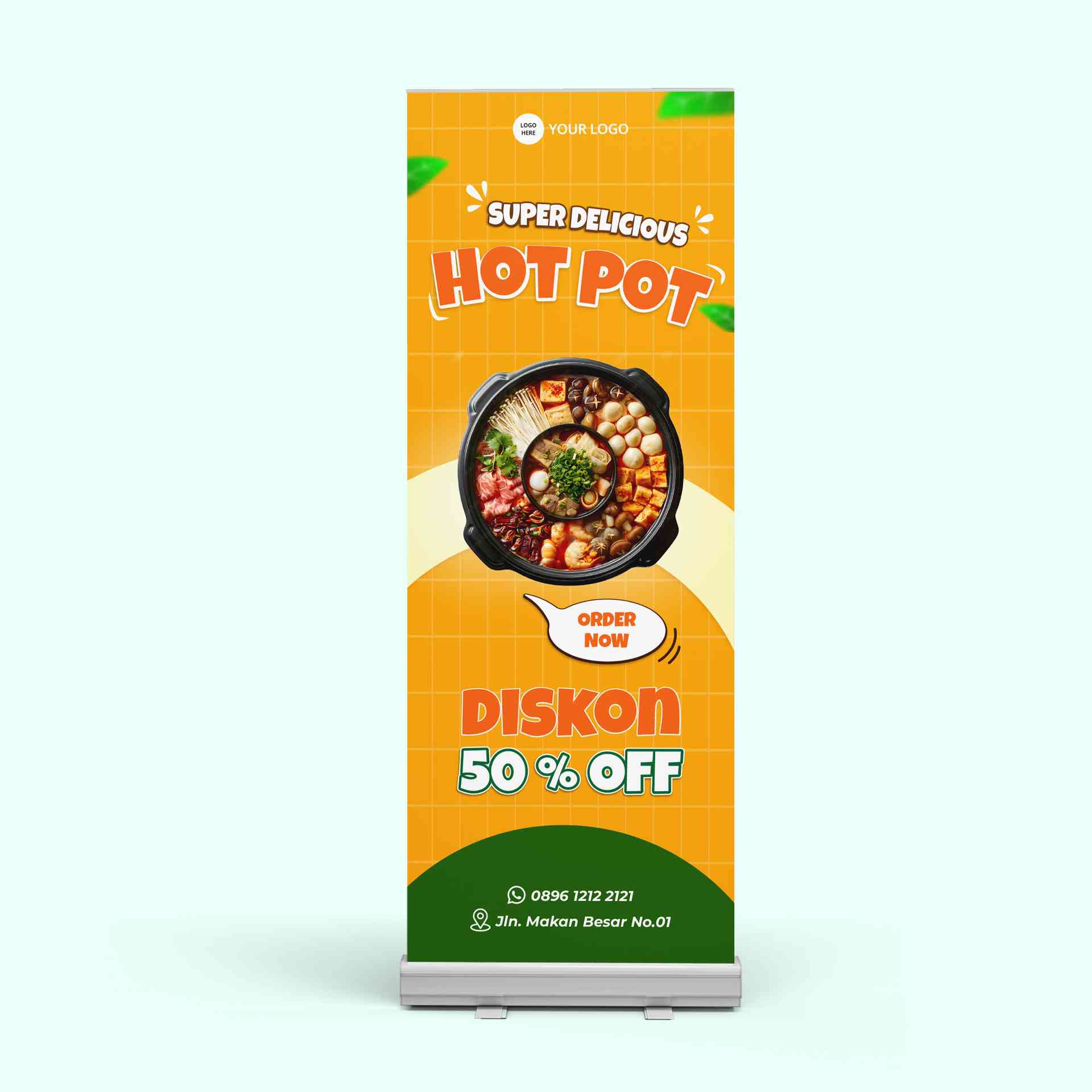 Banner ini menampilkan promo hot pot yang sangat menggugah selera, dengan diskon 50% yang berlaku untuk semua jenis hot pot. Gambar menunjukkan berbag...