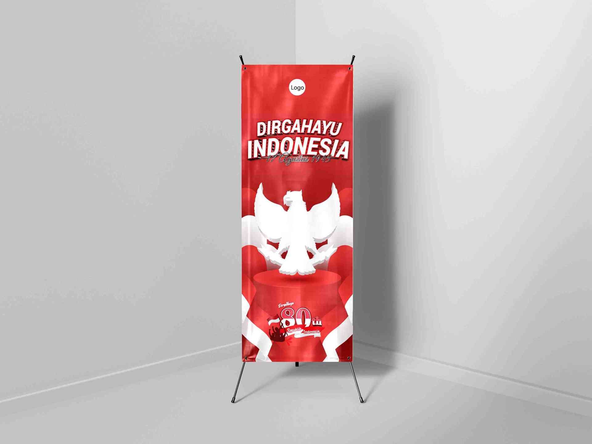 Roll up banner ini sangat cocok untuk event resmi seperti upacara instansi, perusahaan, gedung pemerintahan, maupun acara sekolah. Gaya visualnya yang rapi dan simetris menjadikan banner ini ideal sebagai elemen dekorasi utama untuk memperingati 80 tahun kemerdekaan Republik Indonesia secara berkelas dan membanggakan.