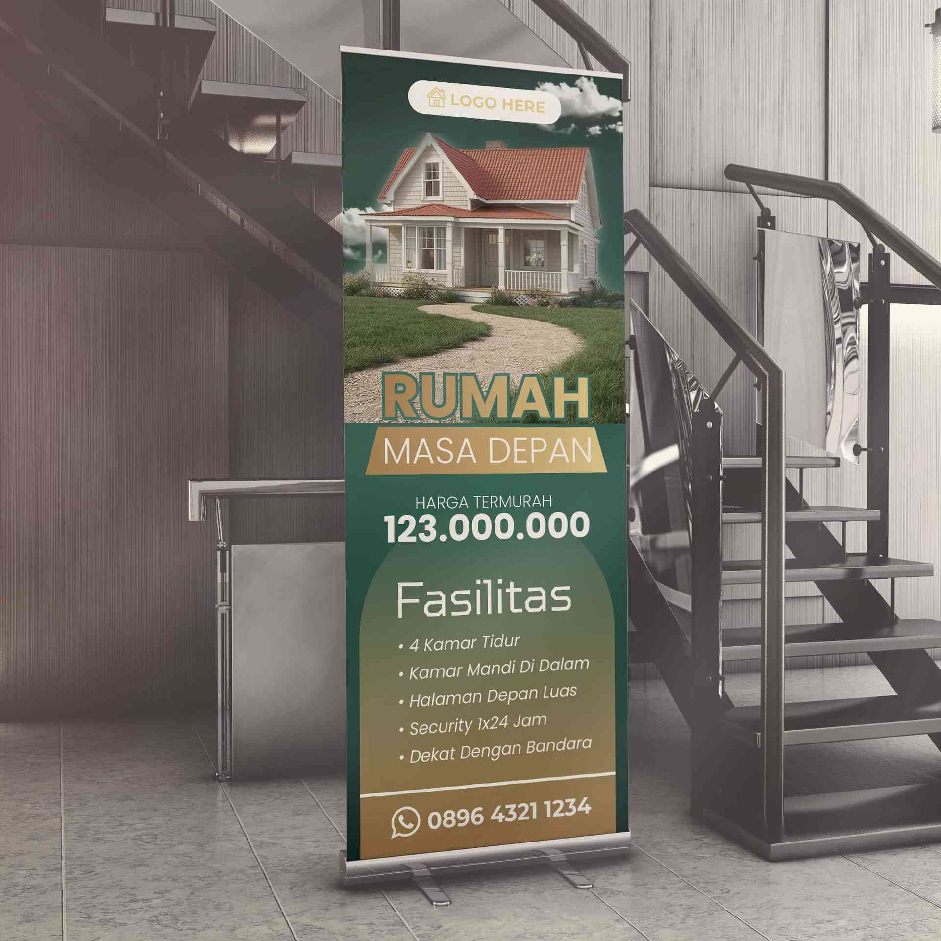 Banner ini menampilkan penawaran rumah masa depan dengan harga terjangkau sebesar 123 juta. Desain banner mencantumkan gambar rumah impian dengan suas...