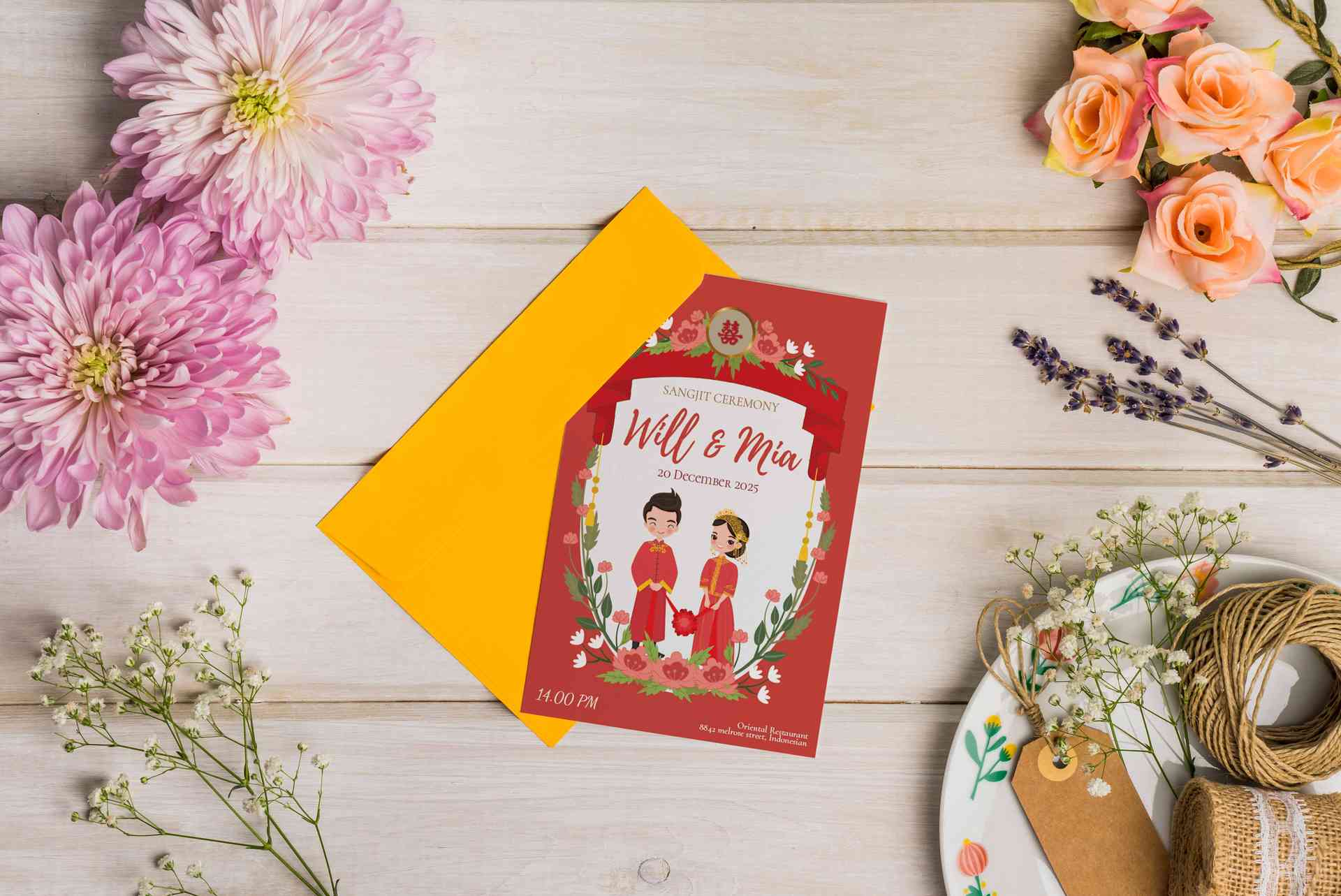 Desain undangan ini menghadirkan nuansa budaya Tionghoa yang kuat dengan sentuhan ilustrasi karakter pasangan Will & Mia mengenakan pakaian tradis...