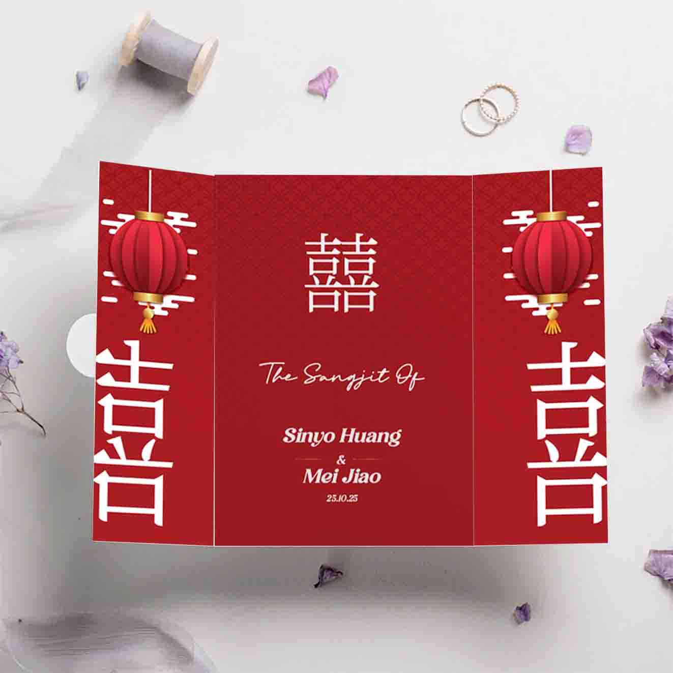 Undangan Pernikahan Oriental Lipat Tiga berbentuk lipatan tiga dengan desain visual bernuansa oriental yang kuat, menampilkan warna merah sebagai warn...