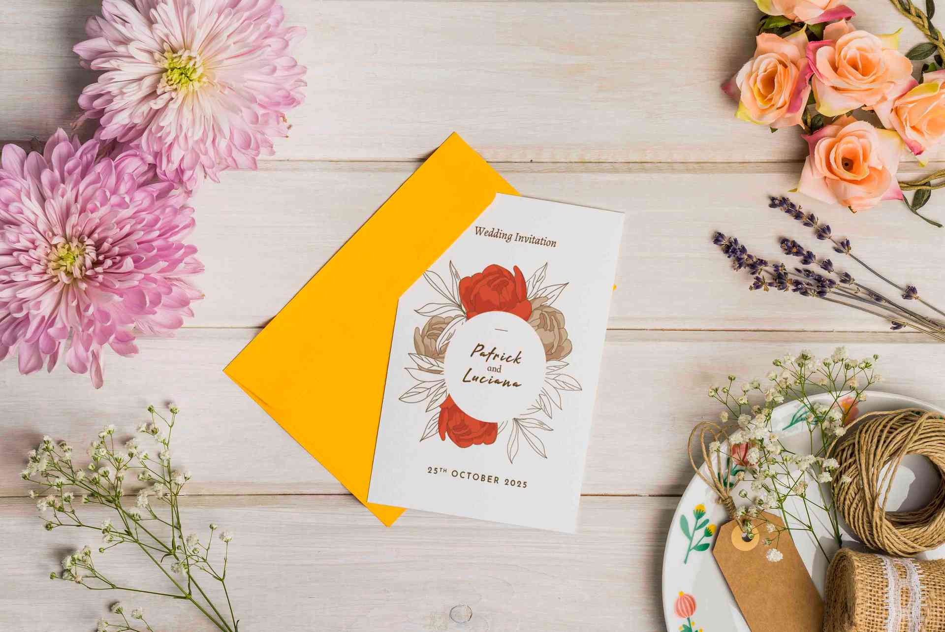 Undangan pernikahan berbentuk persegi panjang dengan desain dominan bunga mawar merah dan sentuhan emas pada bagian tepi, menciptakan nuansa elegan da...